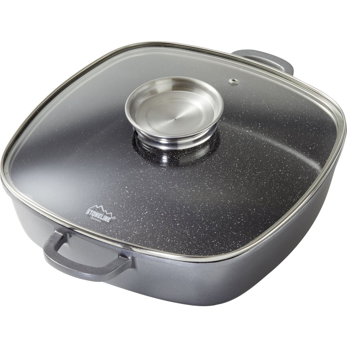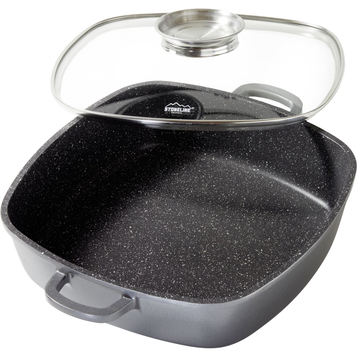STONELINE® - Das Original! Gesund fettfrei kochen und braten! Diese Eckpfanne lässt sich multifunktional einsetzen: Egal, ob Sie Fleisch anbraten, ein Filet garen, einen Braten oder einen Auflauf im Backofen schmoren möchten, mit dieser Pfanne gelingt Ihnen einfach alles. Die Bratpfanne ist eckig damit sich eine zusätzliche Bratfläche von mehr als 25 % gegenüber einer runden Pfanne ergibt. Diese eckige Pfanne ist ein Muss für jeden Küchenhaushalt. Der einzigartige Aroma-Glasdeckel ermöglicht eine dosierte Zugabe von Flüssigkeiten wie z. B. Wein, flüssige Gewürze oder andere Essenzen über den Deckelknauf. So erhalten Ihre verfeinerten Speisen den unverkennbaren Geschmack der zugegebenen Aromen.Die Eckpfanne ist bis 220 °C backofengeeignet und mit der bewährten STONELINE® Antihaftbeschichtung ausgestattet. Zum Herausholen aus dem Ofen ziehen Sie einfach die mitgelieferten Thermo-Schutzhüllen über die Griffe.Hierbei spielt es keine Rolle, ob Sie auf Glaskeramik, Induktion, Elektro oder Gas kochen. In der Stoneline Eckpfanne mit der original STONELINE®-Beschichtung bleiben keine hartnäckigen Reste haften und die einfache Handwäsche spart Ihnen Zeit und Mühe. 1 Eckpfanne Induktion 1 Aromaglasdeckel 2 Thermogriffschützer