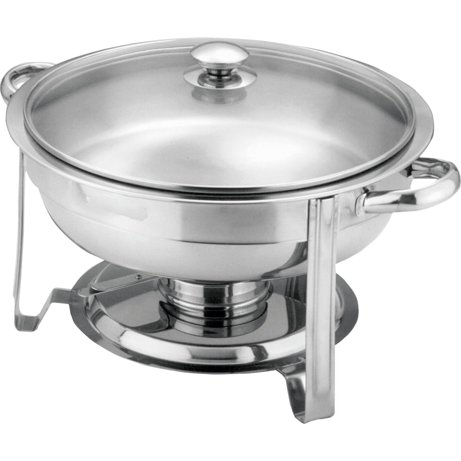 Edelstahl 18/10, rund - mit Glasdeckel, komplett mit Wasserbad und Speiseneinsatz (4,5 L), mit Brennstoffhalter, inkl. Deckelhalterung.
