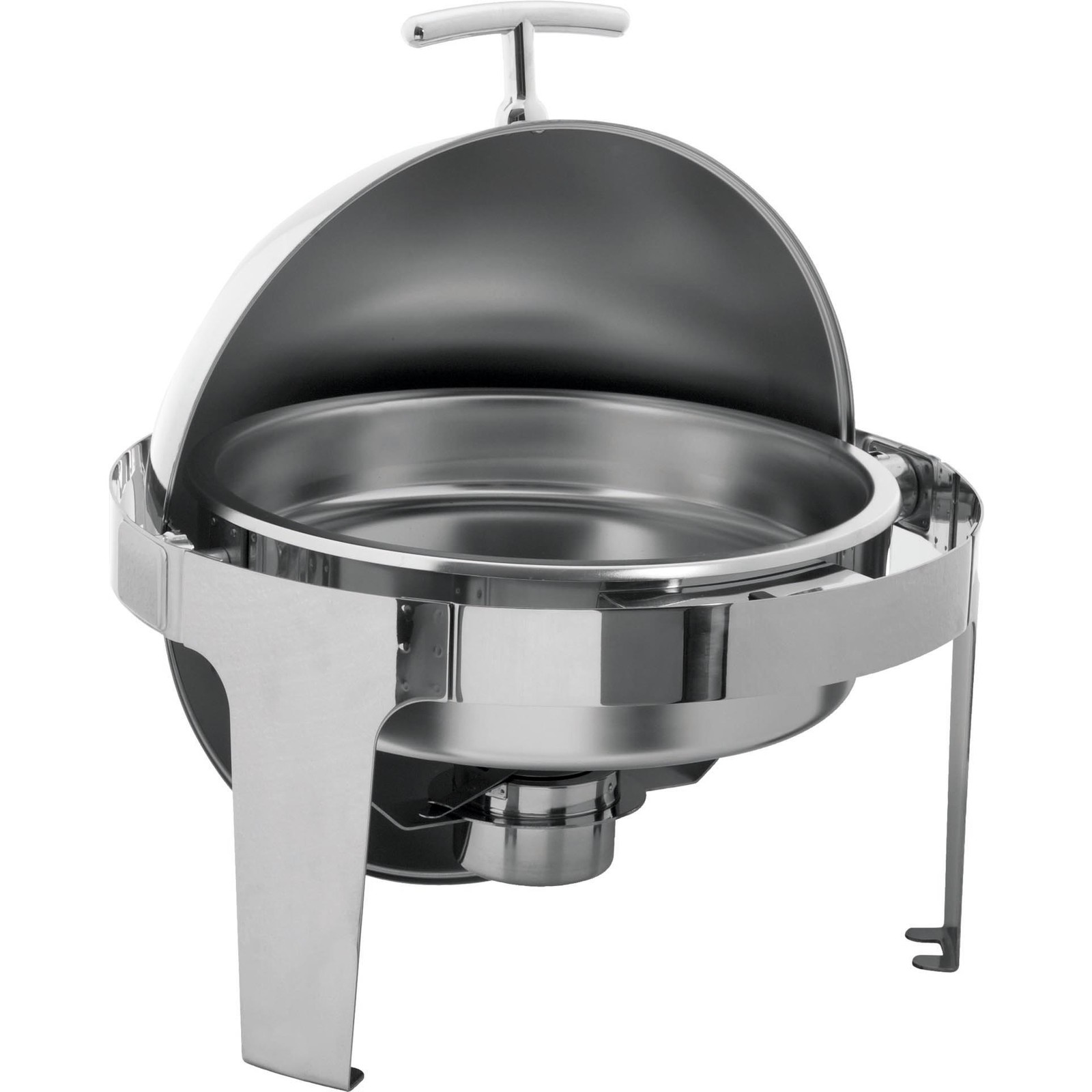 Edelstahl 18/10, poliert, rund mit Rolltopdeckel. Inhalt: 6 Liter. Komplett mit Einsatz 65 mm tief und einem Brennstoffhalter. Schwere Ausführung.