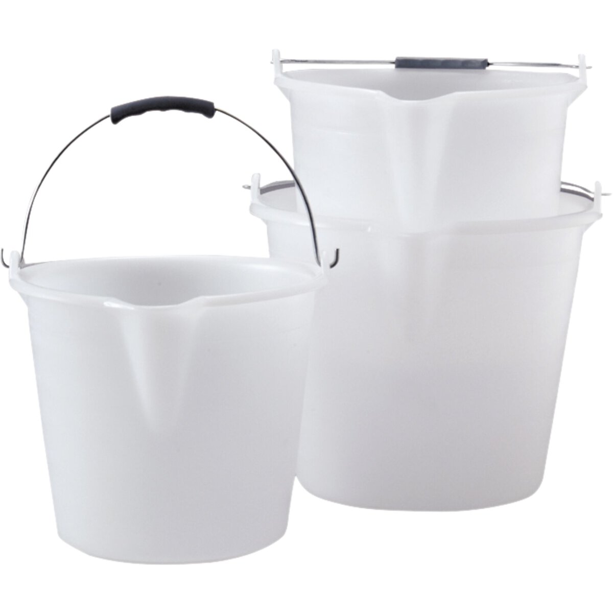 NPE (Niederdruck-Polyethylen), weiß-natur. Mit Ausguss, Metallbügel und Literskala (innen). Temperaturbereich -40°C bis +80°C. Nicht geeignet für stark säure- und laugenhaltige Produkte. Nicht spülmaschinengeeignet.