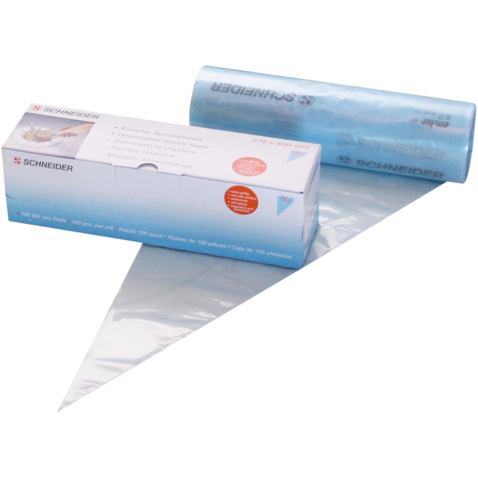 PE, blau-transparent, dreifach extrudiert. Außenseite griffig, Innenseite glatt. Mit Abreißperforation. Gerollt. Im 100er Pack.