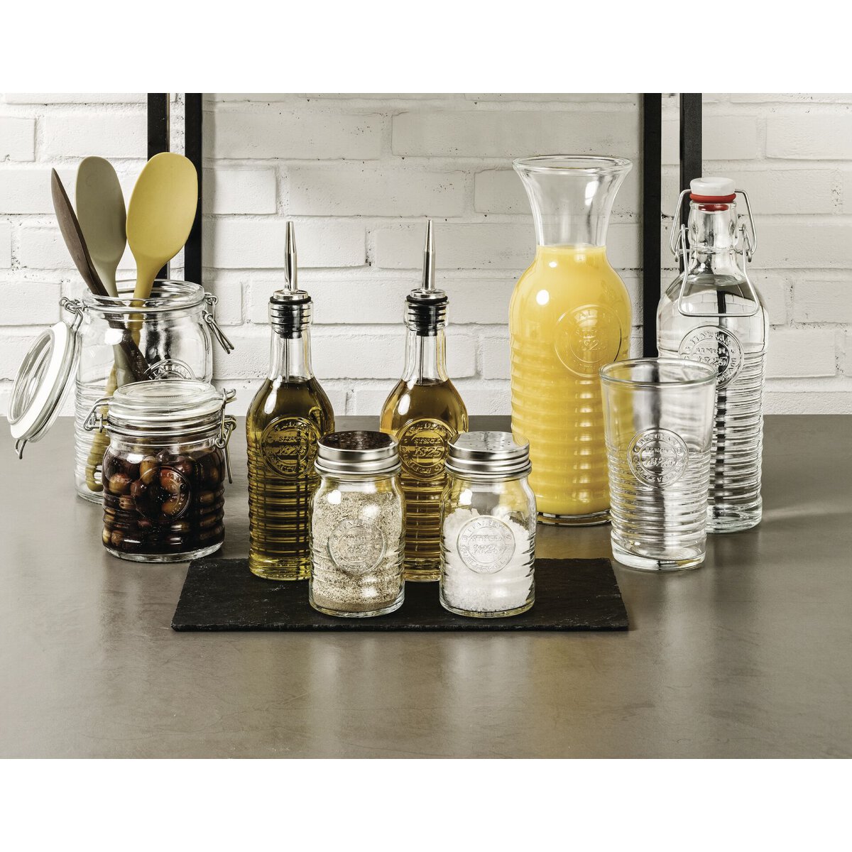 Glasflasche mit Relief-Streifen und Retro-Logo. Mit Ausgießer. Ausgießer bitte per Hand spülen.