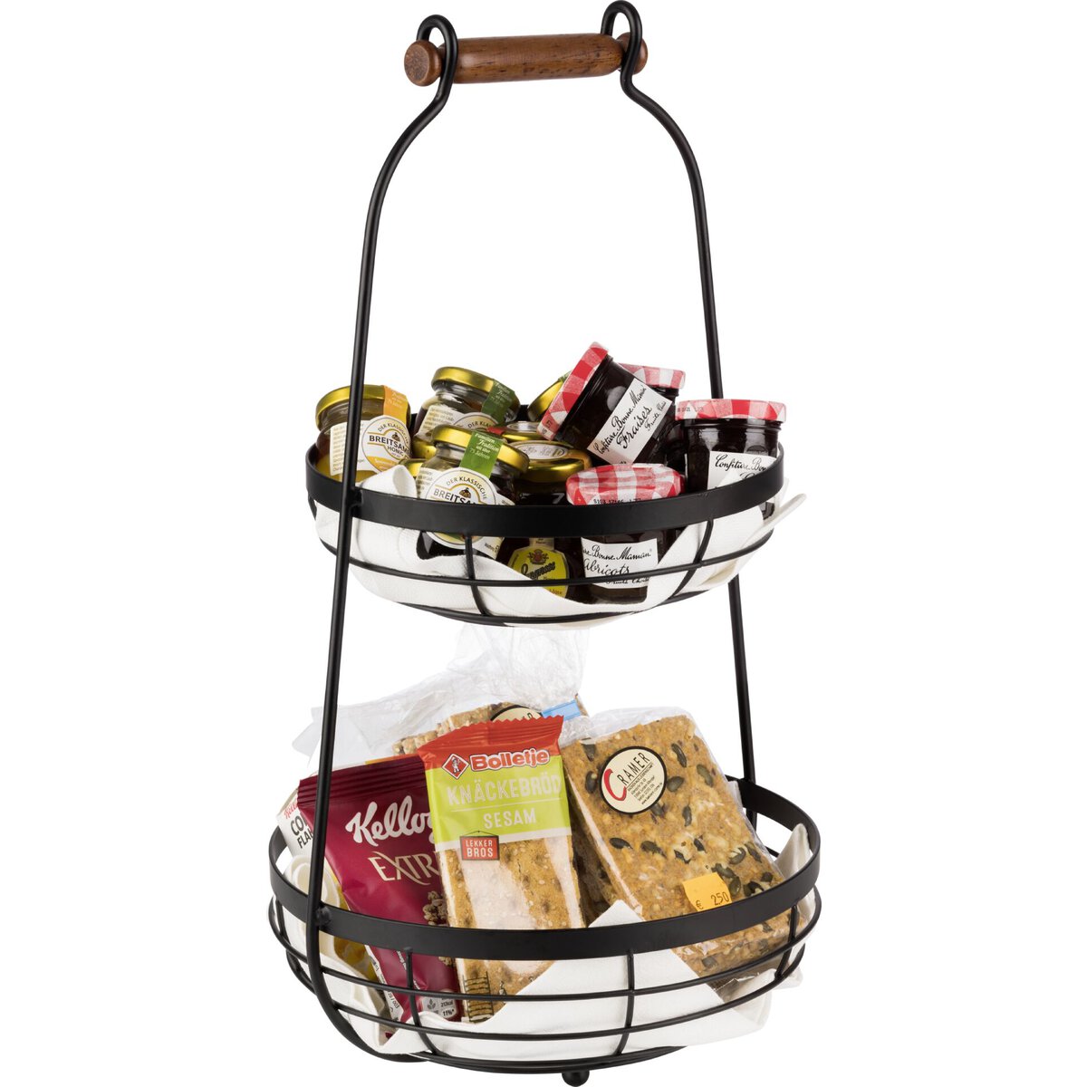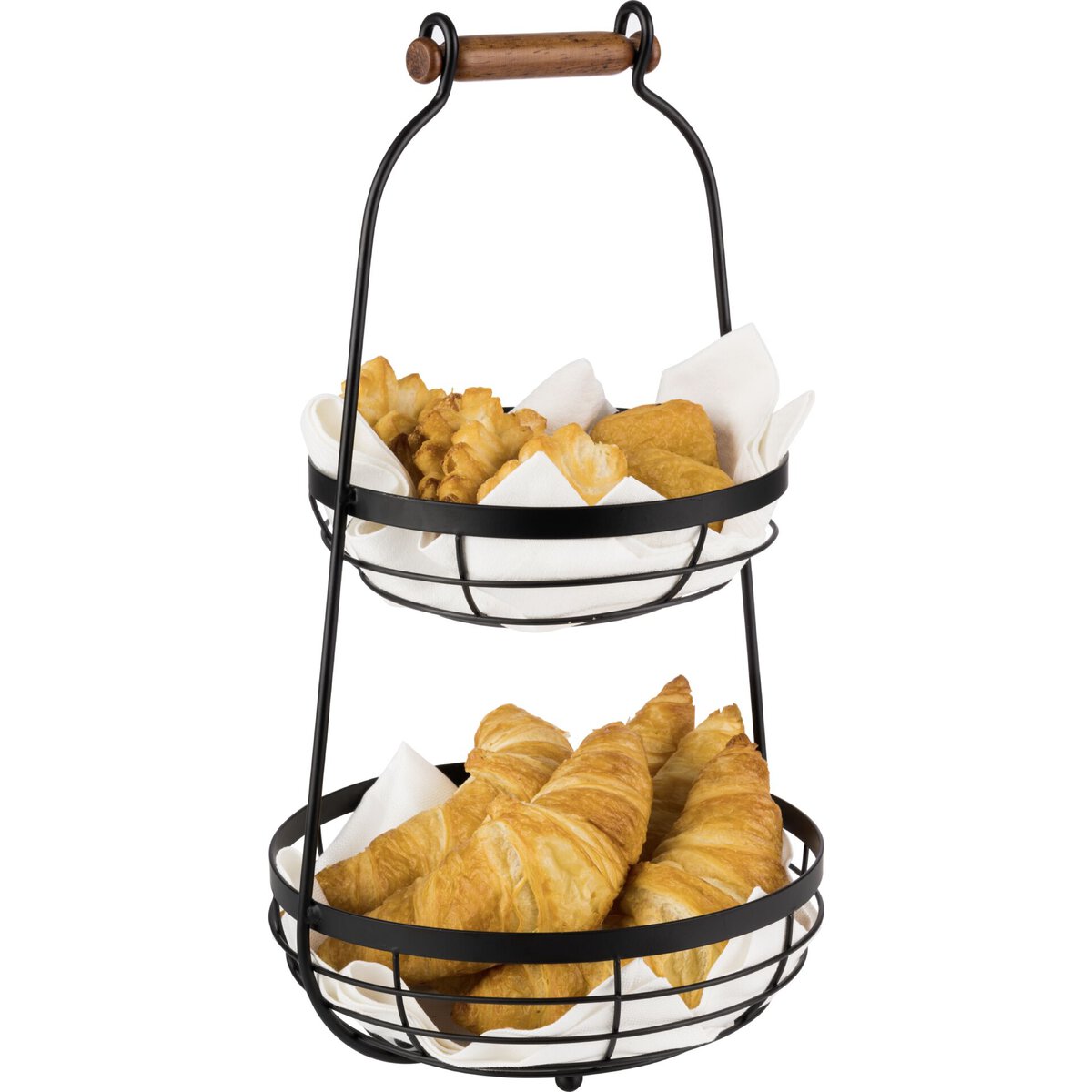 2-stufige Etagère, bestehend aus Holz (Griff) und schwarzem Metall (Körbe und Rahmen). Unterer Korb (Ø 26cm, H: 8cm). Oberer Korb (Ø 22cm, H: 6cm). Nicht spülmaschinengeeignet!