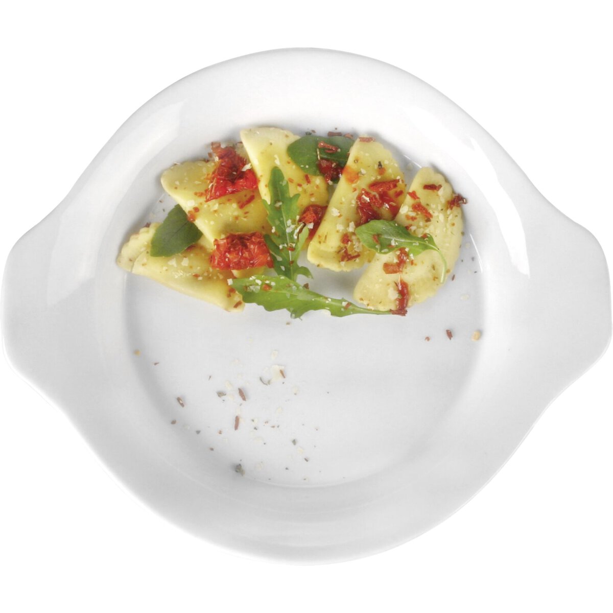 Porzellan, weiß. Planer Boden. Feuerfest bis 300°C. Spülmaschinengeeignet. Mikrowellenfest.