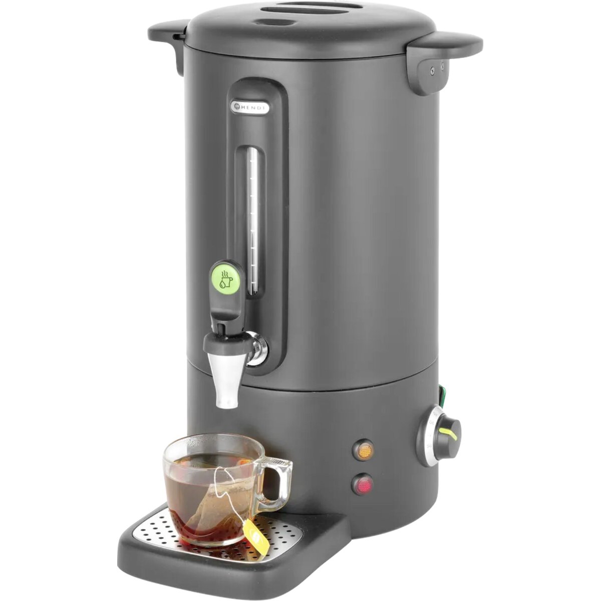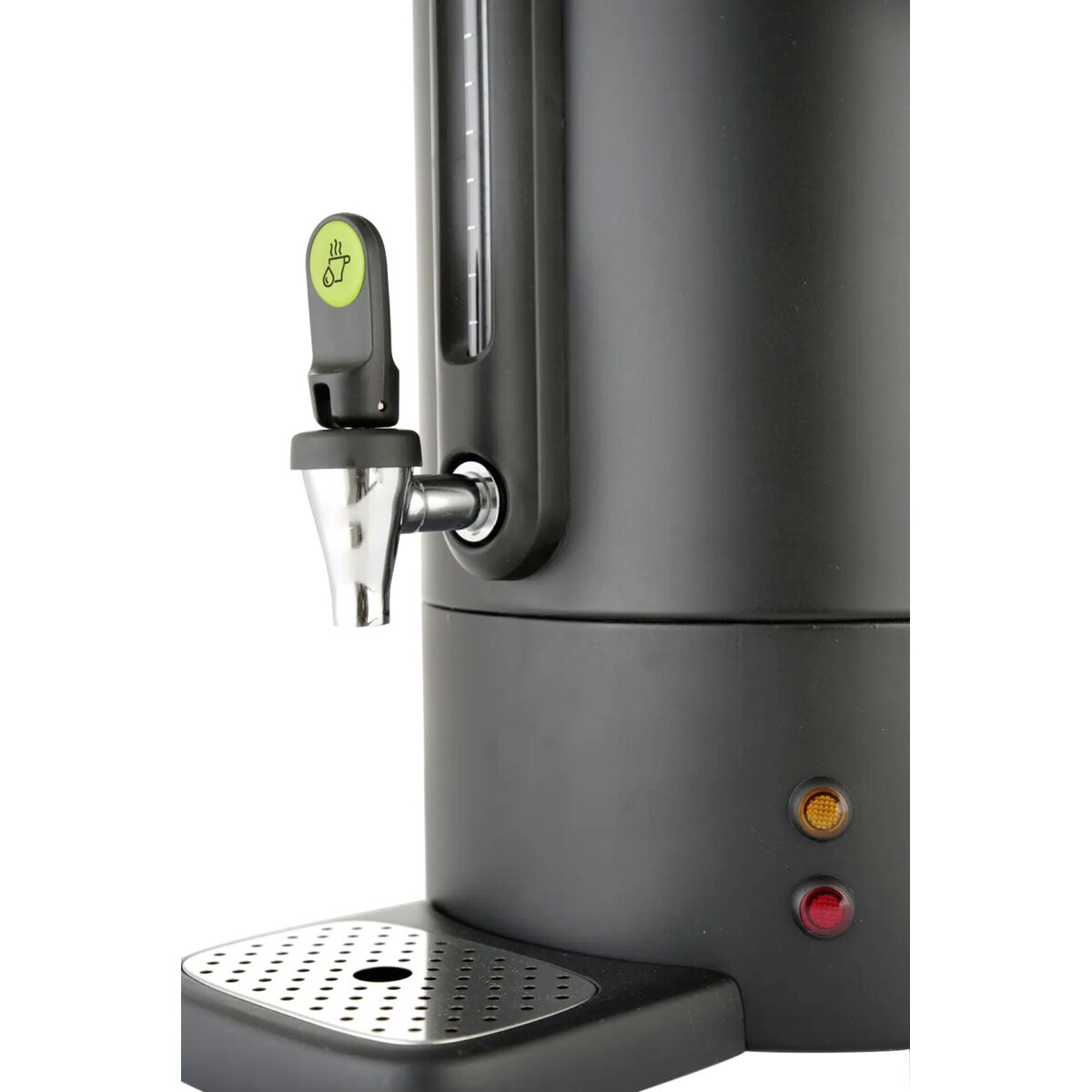 Einwandiges Gehäuse aus Edelstahl. Griffe aus Polypropylen. Tropffreier Wasserhahn. Wasserstandanzeige aus Glas. Die Tropfschale ist mit einem Magnet befestigt und leicht zu reinigen. Thermostat-Anzeige. Maximale Flüssigkeitsstandanzeige im Inneren des Geräts. Die Temperatur kann im Bereich von 30°C bis 100°C eingestellt werden. Maximale Becherhöhe: 10cm. Reset-Taste - zur Verwendung bei Überhitzung. Warnleuchte für Überhitzung oder wenn eine Entkalkung erforderlich ist. Nur zum Kochen von Wasser oder Wein - nicht geeignet für andere Flüssigkeiten wie Milch oder heiße Schokolade.