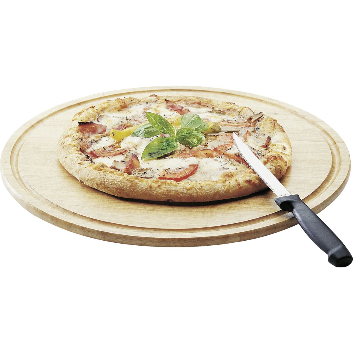 Hartholz, mit Saftrille, nicht spülmaschinengeeignet. Ideal als Servierbrett, Pizzateller oder Brotzeitteller.