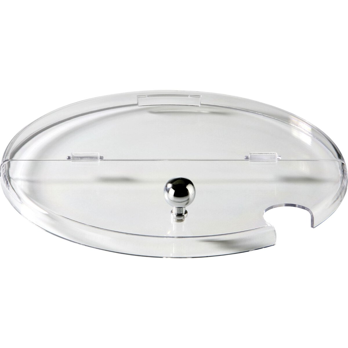 Acryl, klar, aufklappbar, mit Edelstahlknopf und Löffelaussparung.