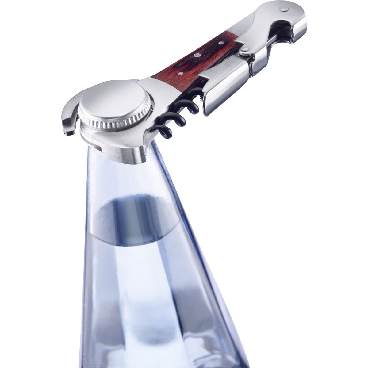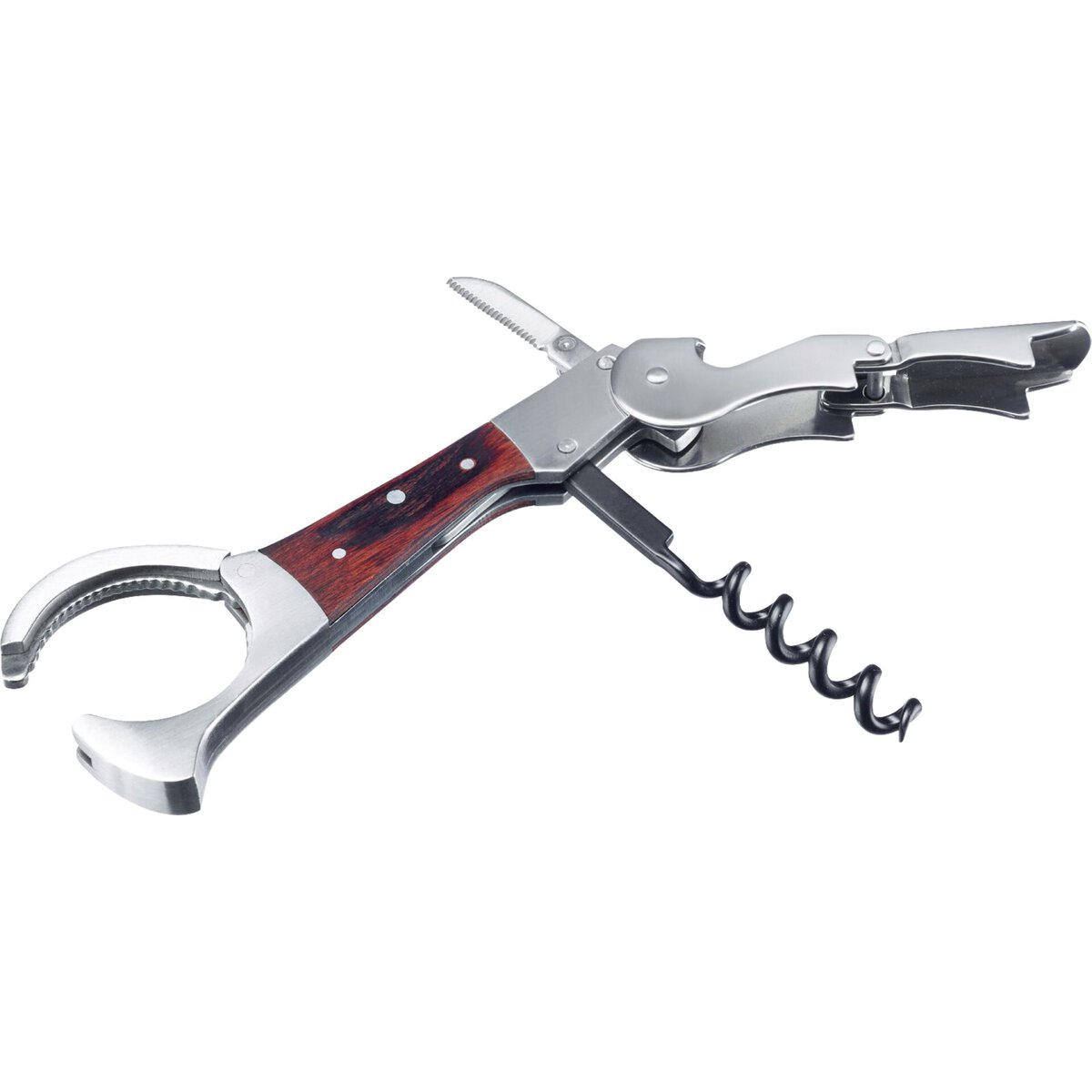 Aus hochwertigem Edelstahl mit Holzinlay, mit gezackter Klinge zum Kapselschneiden, der 2-Stufen Hebel erleichtert das Herausziehen des Korkens, mit Kapselheber für Kronkorken, beschichteter Wendel mit Seele, mit Zangenelement zum Öffnen von festsitzenden Schraubverschlüssen, nicht spülmaschinengeeignet.