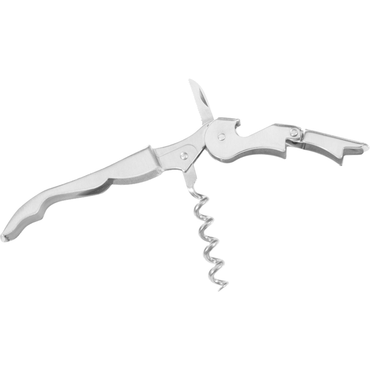 Edelstahl. LxBxH in cm: 14x1,5x2,5. 2-Stufen-Hebel erleichtert das Herausziehen des Korkens. Kapselheber. Scharfe Klinge.