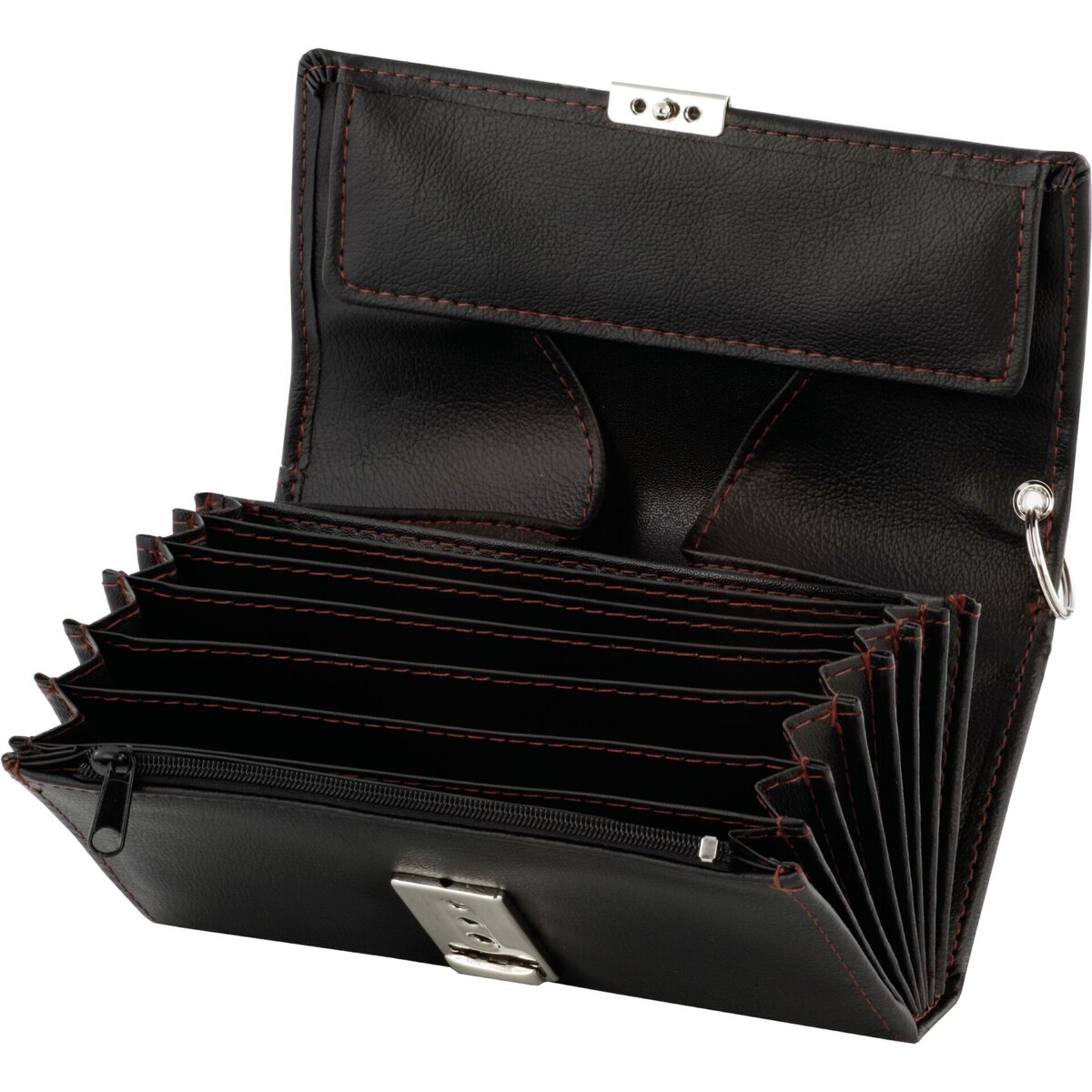 Kunstleder/Feinsynthetik, schwarz, braun abgenäht. Kellnerbörse inkl. Schlüsselkette mit Karabiner, besteht aus: 1x Münzfach, 7x Scheinfach, 1x Reißverschlussfach, 1x Steckfach an der Rückseite. Revolvertasche bestehend aus 1x Fach für die Kellnerbörse und 1x Zusatzfach für Notizblock und Kugelschreiber.