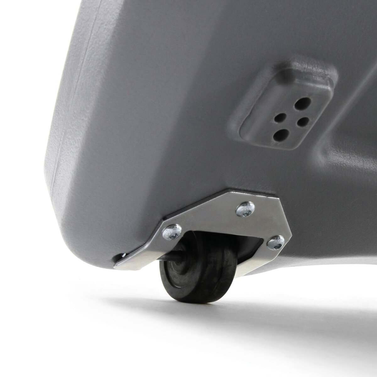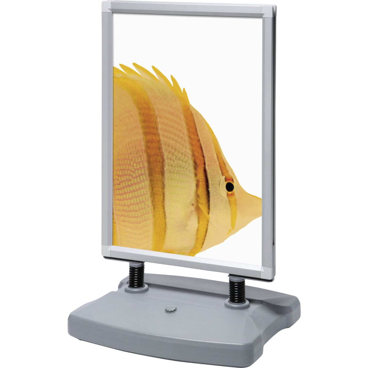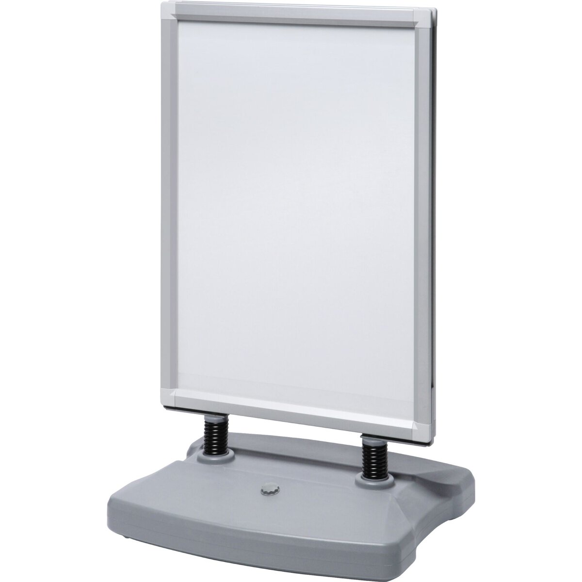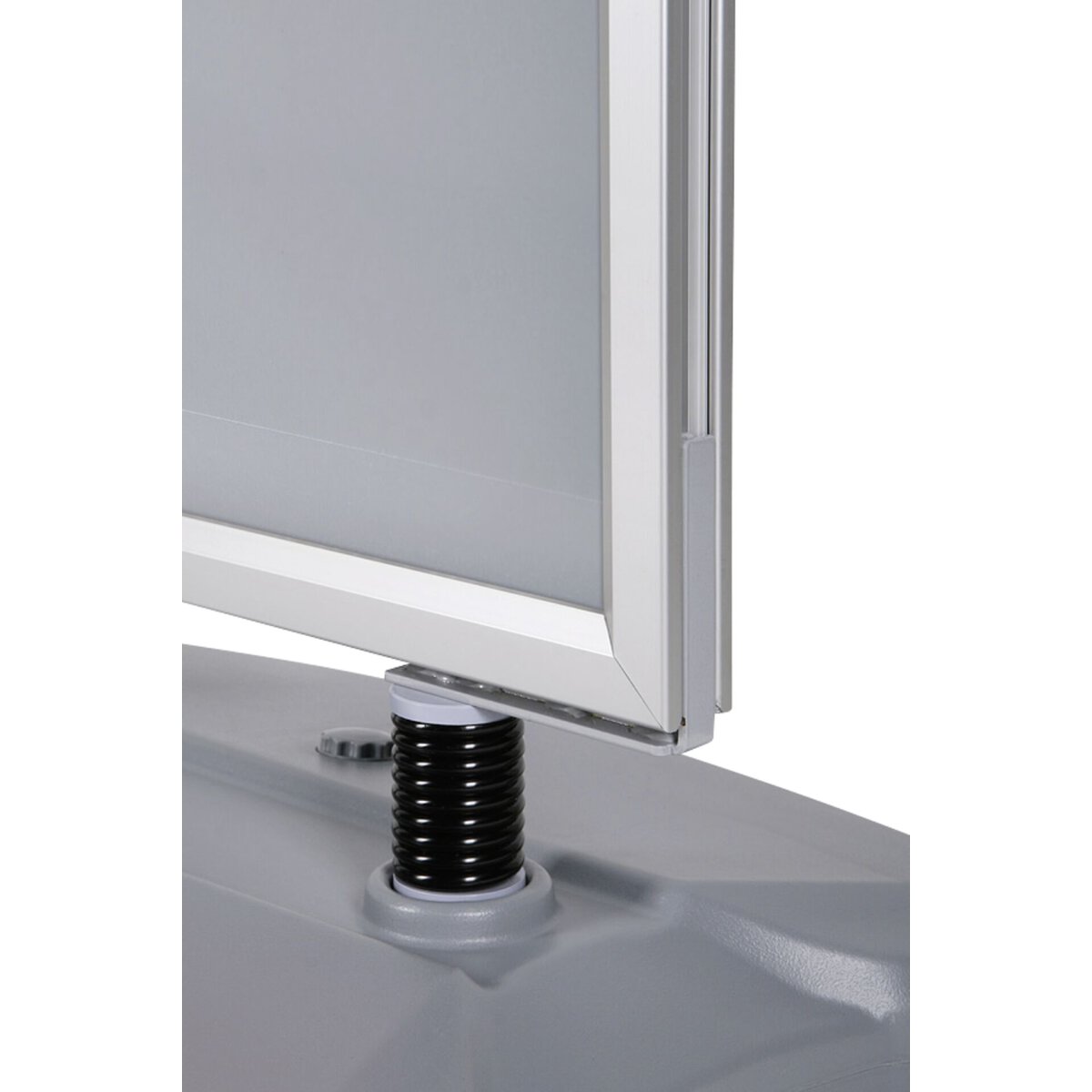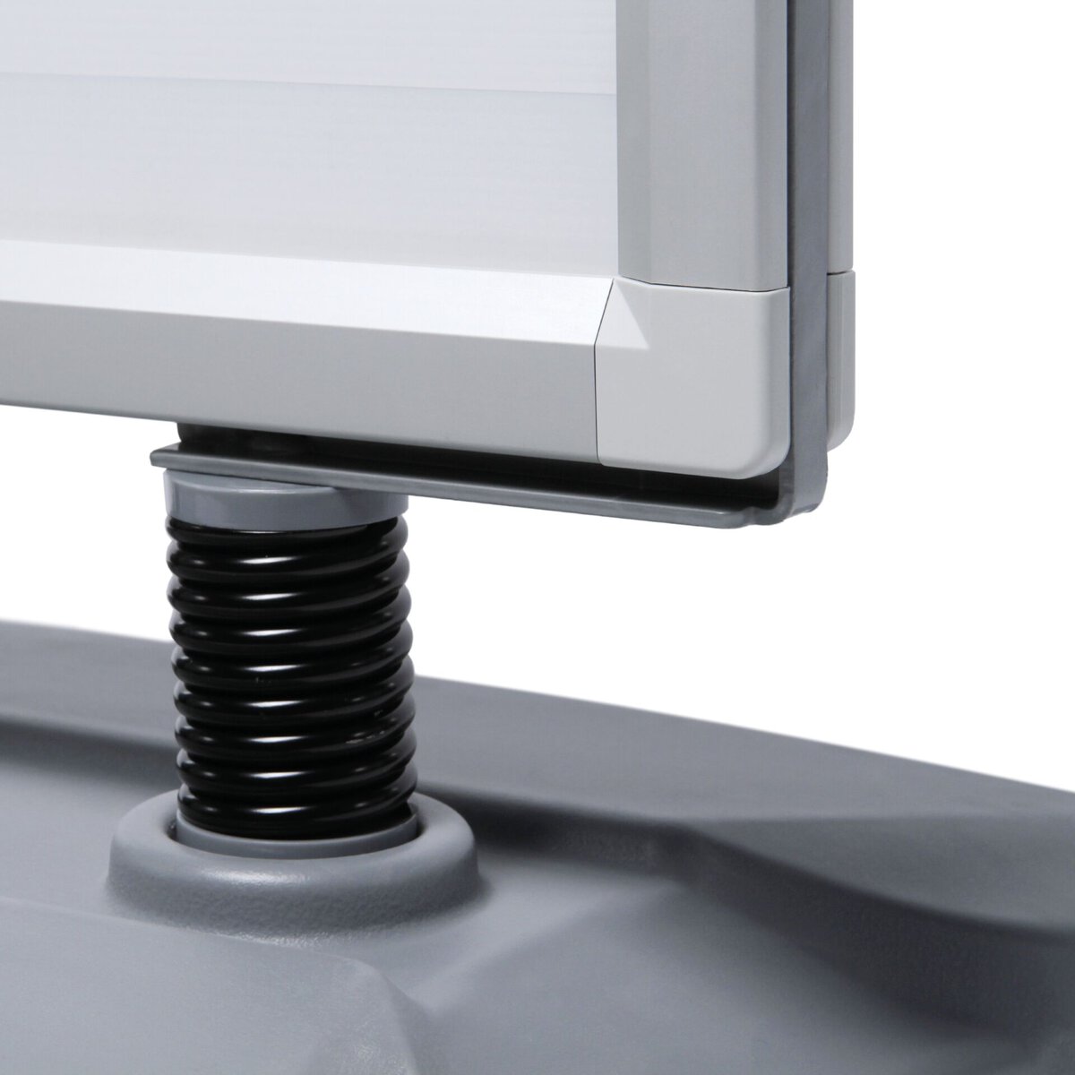 Aluminium, Kunststoff. Auch bei starkem Wind sehr stabil und standsicher. 2 Rollen an der Unterseite für einen leichteren Transport. Fuß kann mit Wasser oder Sand befüllt werden. Für den Außenbereich geeignet. Logodruck auf Anfrage.