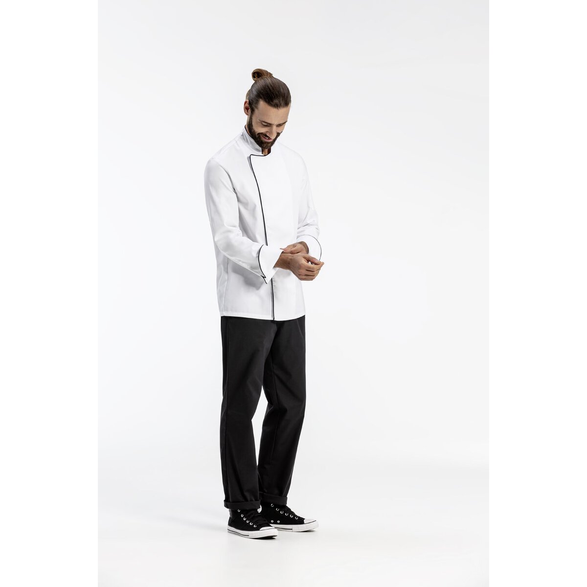 Farbe: weiß mit schwarzer Paspelierung. 65% Polyester + 35% Baumwolle, 210g/m². Regular fit. Armtasche, verdeckte Druckknöpfe, Lüftungslöcher, Wiener Nähte im Rücken. Ärmel mit Umschlagmanschette. Waschen: Normalwaschgang 95°C, Bleichen: nicht bleichen, Trocknen: Trocknen im Tumbler, niedrige Temperatur, 60°C, normaler Trocknungsprozess, Bügeln: Bügeln mit einer Höchsttemperatur der Bügeleisensohle von 150°C, prof. Textilpflege: professionelle Trockenreinigung, normaler Prozess.