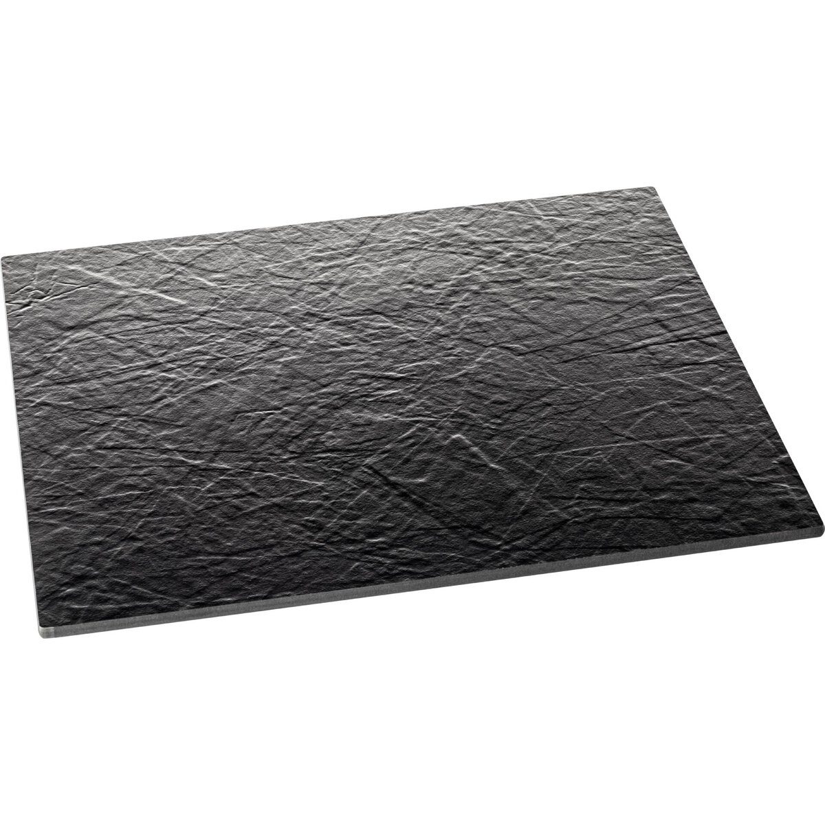 Kunstschiefer. Mit Antirutsch-Gummifüßchen. Lebensmittelunbedenklich, bruch- und kratzfest, geringes Gewicht, spülmaschinengeeignet, hitzefest bis 160°C (nicht für Backofen geeignet).