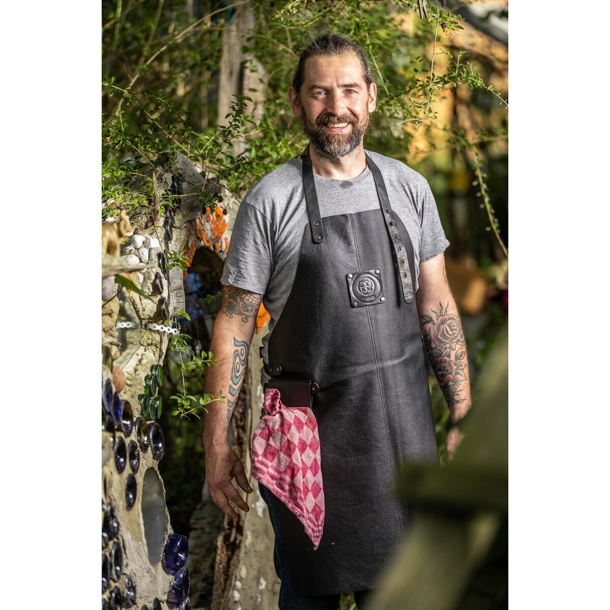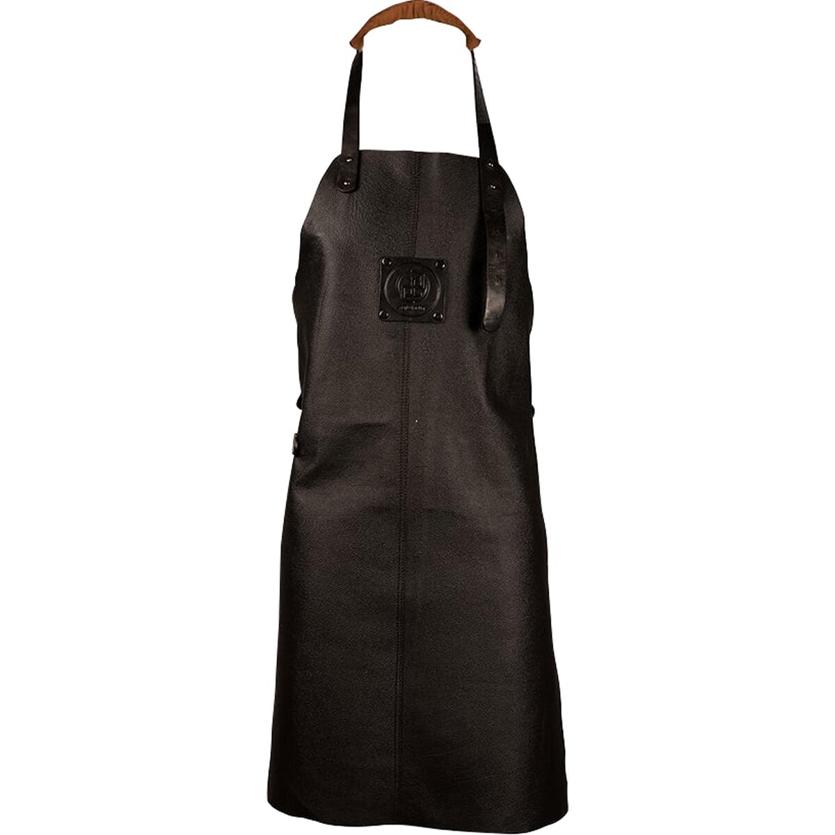 Latzschürze aus schwarzem Rindsleder. Nicht waschbar, nur feucht abwischen. Die Latzbandlänge lässt sich in sechs Stufen einstellen. Für einen angenehmen Tragekomfort sorgt eine Baumwollpolsterung im Nackenbereich. Ein Lederband auf der rechten Seite ermöglicht das Befestigen eines Geschirrtuchs. Maße L: 83cm, B: 62cm.