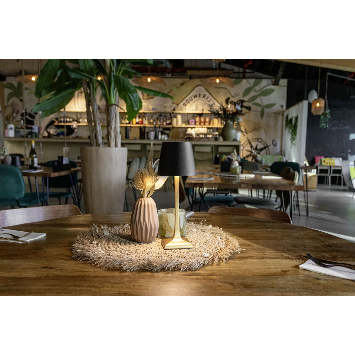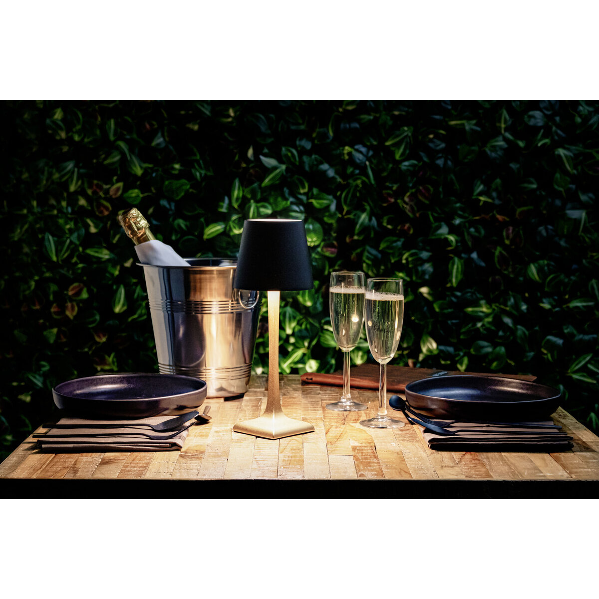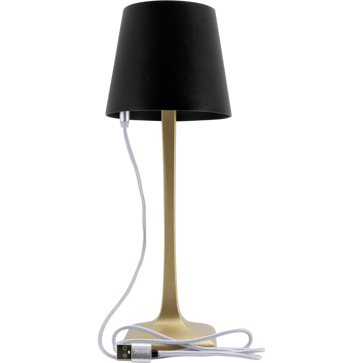 Tischleuchte mit integr. LED und Akku, schwarz/gold. Stufenlos dimmbar. Wasserdicht nach IP54. Inkl. magnetischem USB Schnellladekabel. Lichttemperatur: 2800K.