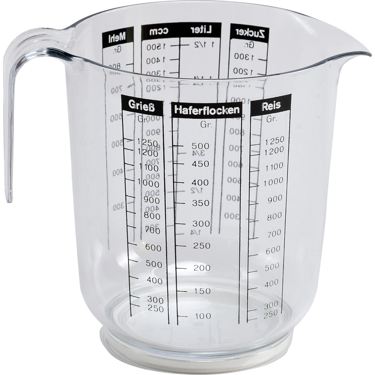 SAN Styrolacrylnitril, transparent. Mit Gummifuß. Messskala, schwarz für Mehl und Zucker, Maßeinheit in Liter und ccm. Skalen für Grieß, Haferflocken und Reis in Gramm auf gegenüberliegender Seite. Spülmaschinengeeignet. Made in Germany!