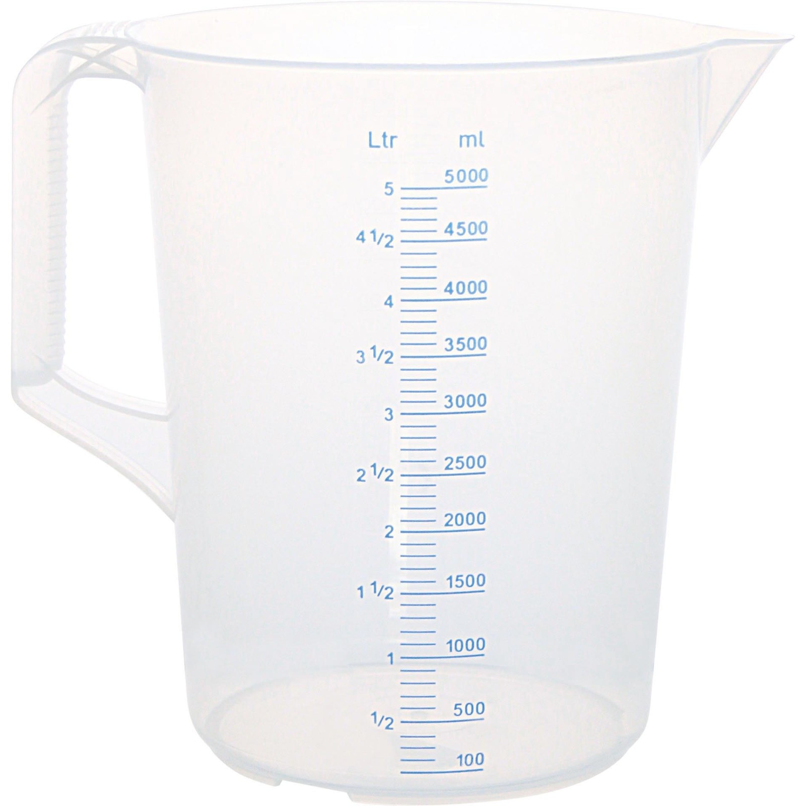 Kunststoff PP, transparent, geprägte Skala und blauer Skaladruck, Liter- und Millilitereinteilung.