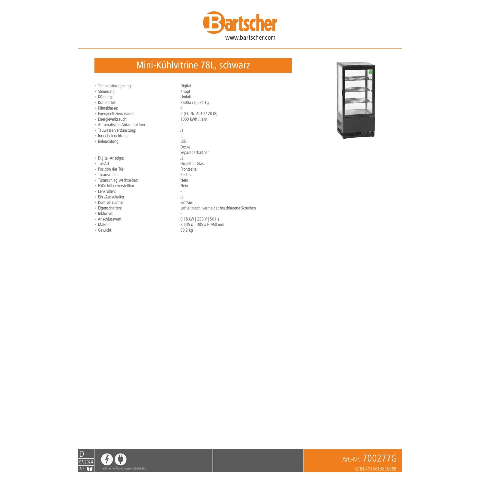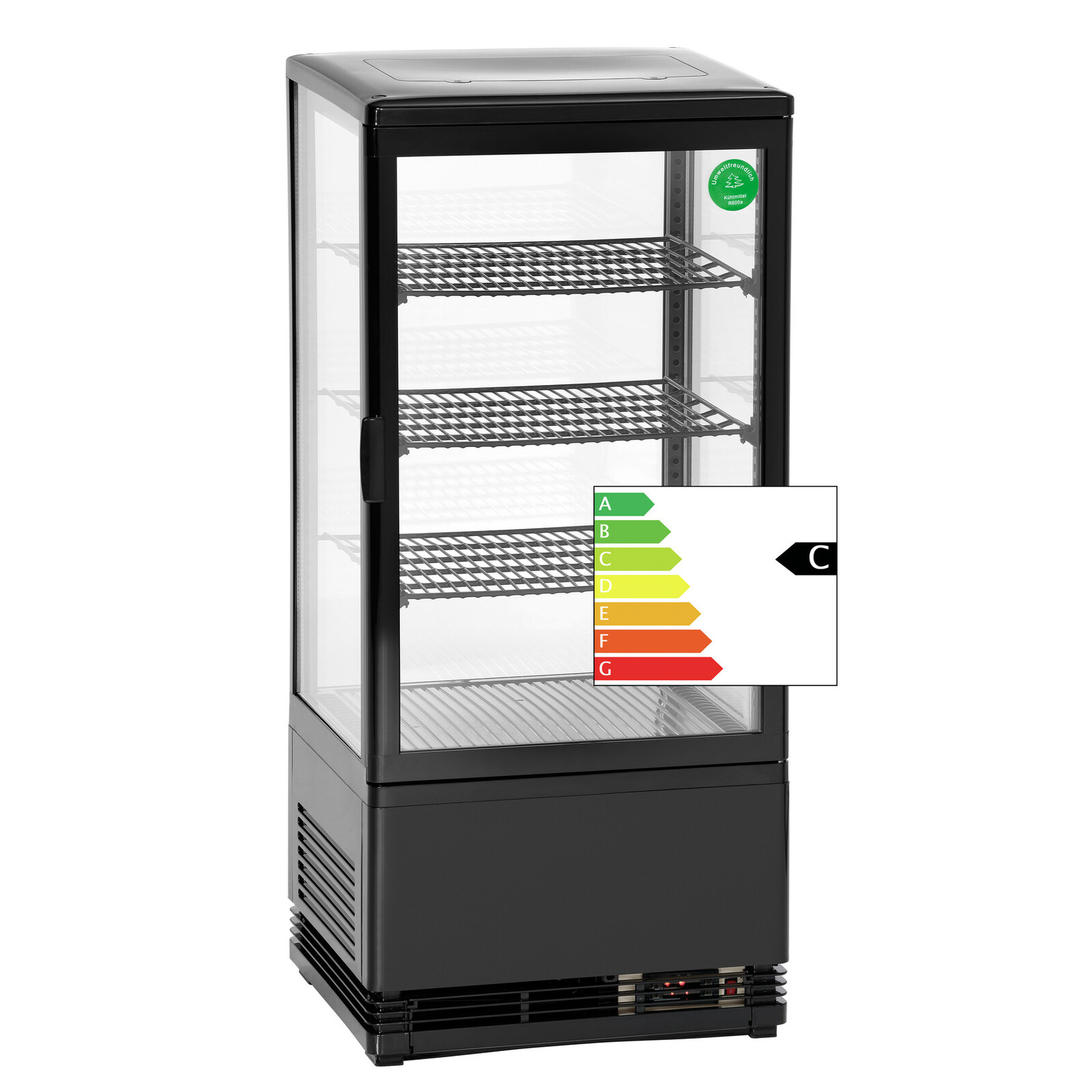 Umluftkühlschrank mit Beleuchtung und automatischem Abtauprozess. Betriebstemperatur: 2°C bis 12°C. Kühlmittel R600a. Mit Ein-/Aus-Schalter. Doppelverglasung. Anschlusswert: 230V/50Hz/180W.