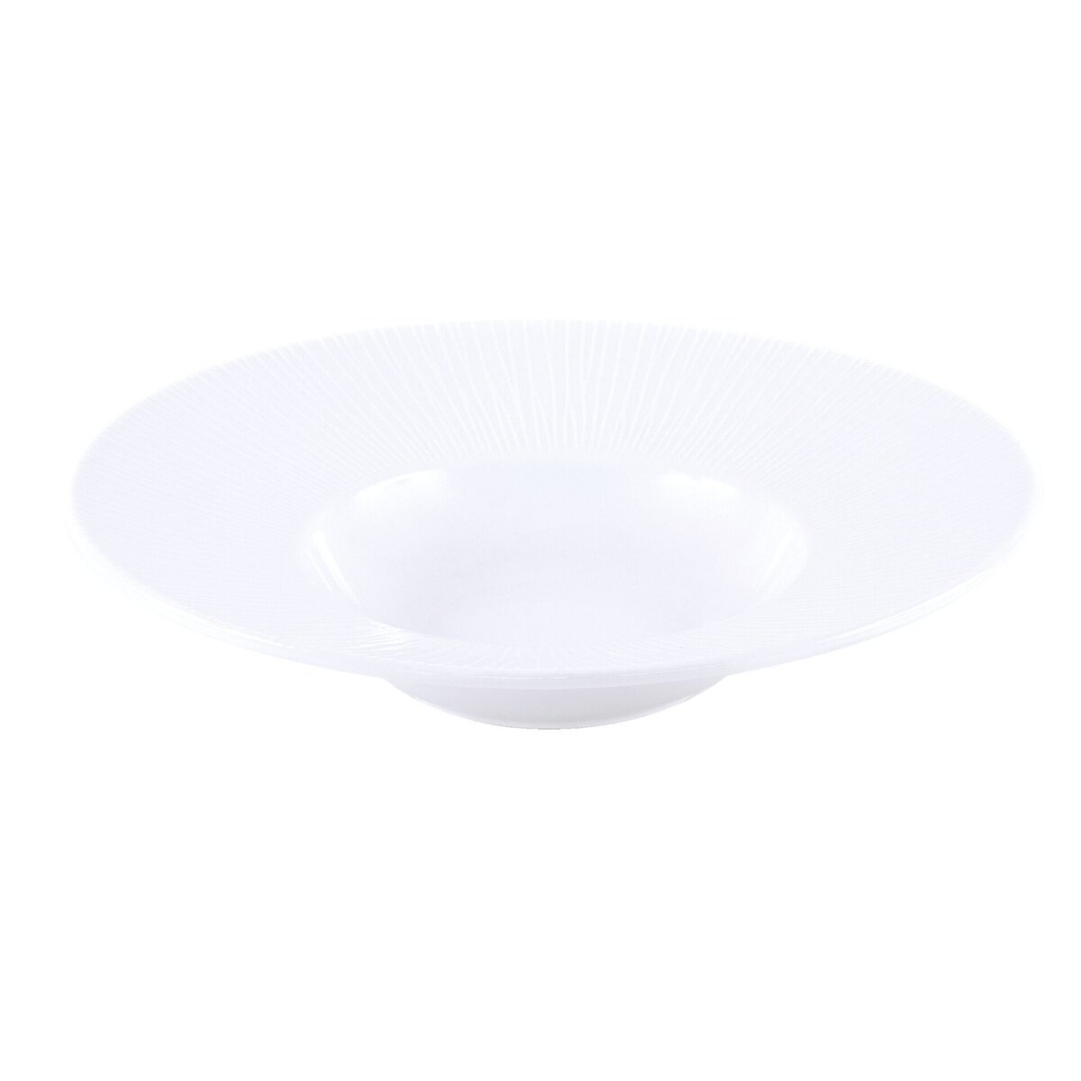 Teller aus weißem Porzellan mit breiter Fahne (6cm) im Rillen-Design. Mischsortierung. Spülmaschinengeeignet.