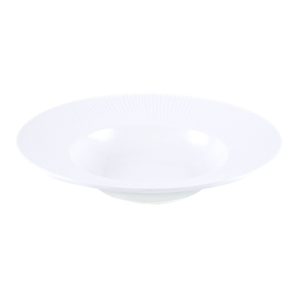 Teller aus weißem Porzellan mit breiter Fahne (6cm) im Rillen-Design. Mischsortierung. Spülmaschinengeeignet.