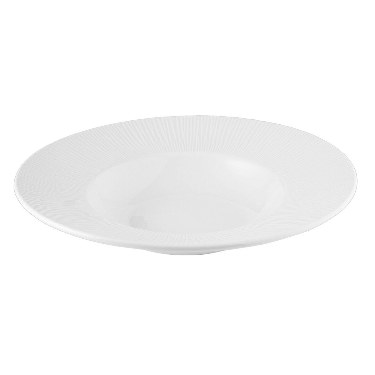 Teller aus weißem Porzellan mit breiter Fahne (6cm) im Rillen-Design. Mischsortierung. Spülmaschinengeeignet.