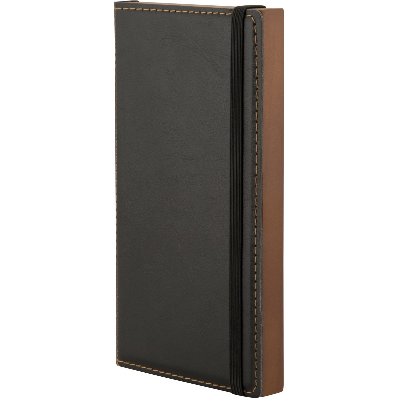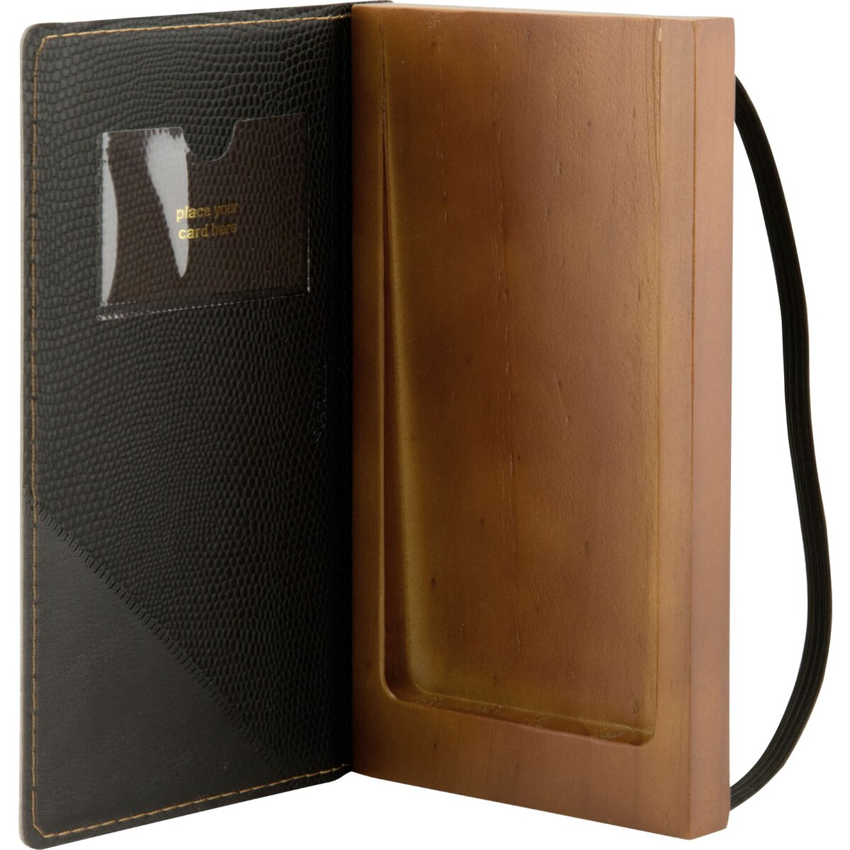 Polyurethan Rechnungsmappe (Lederoptik) mit handgestickten Seitenrändern und hölzernem Münzhalter. Einsteckfach für Karten. Mittels elastischem Band leicht zu schließen.