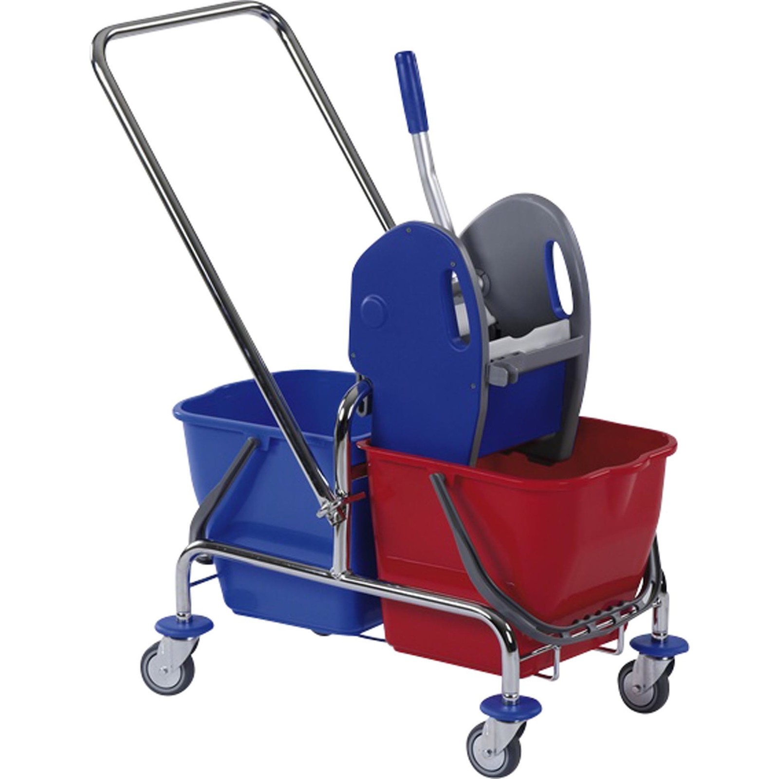 Doppel-Reinigungswagen, Gestell verchromt. Inkl. 2 Eimern je 17 Liter in den Farben rot und blau. Mit Mop-Presse und Deichsel. Höhe inkl. Mop-Presse: ca. 89 cm. inkl. Schiebebügel L:72cm B:42cm H:89cm