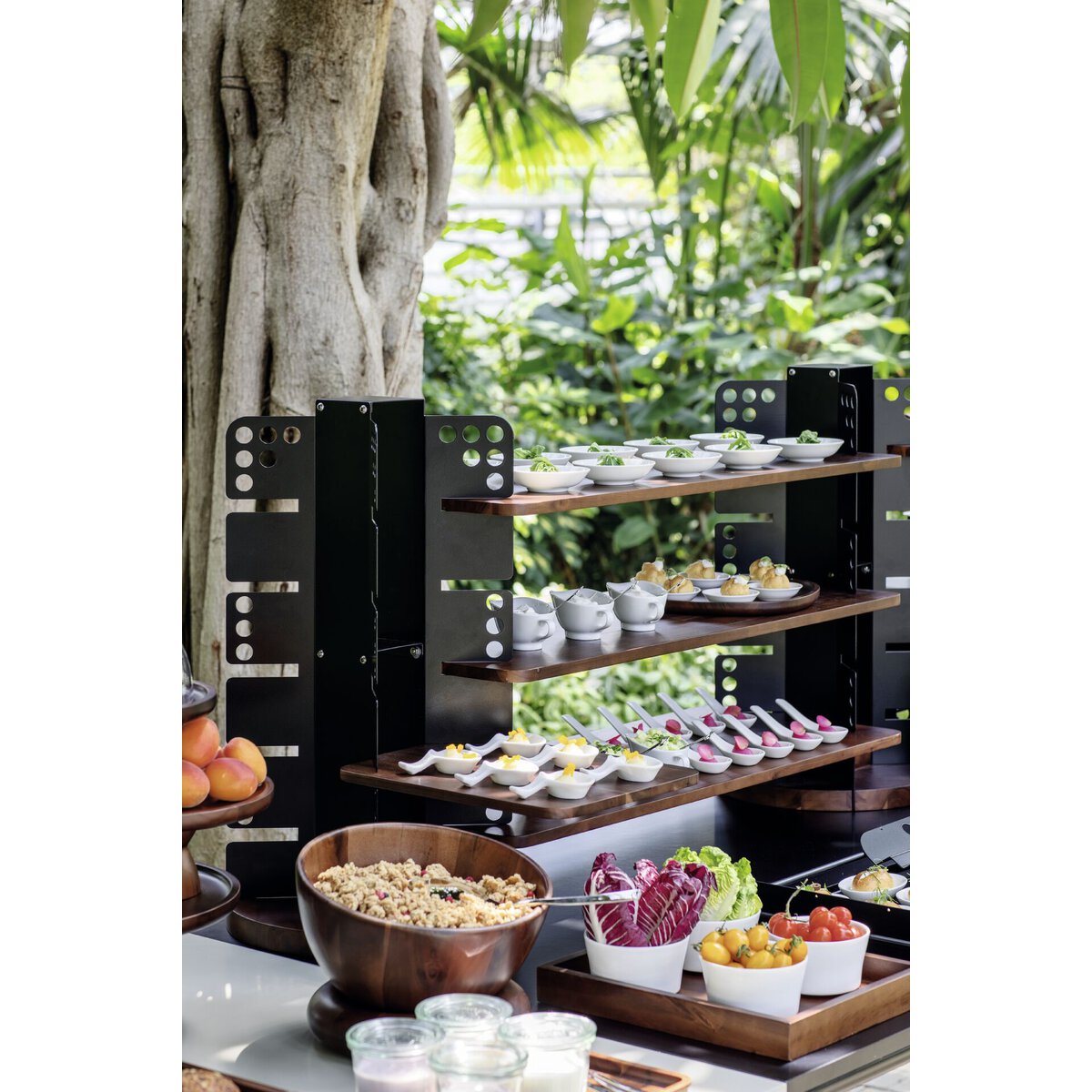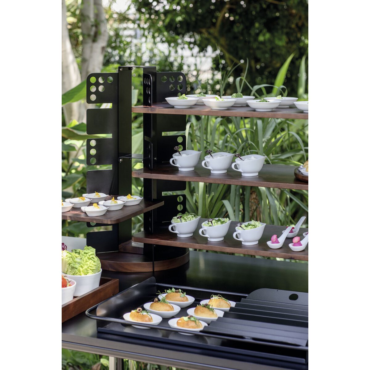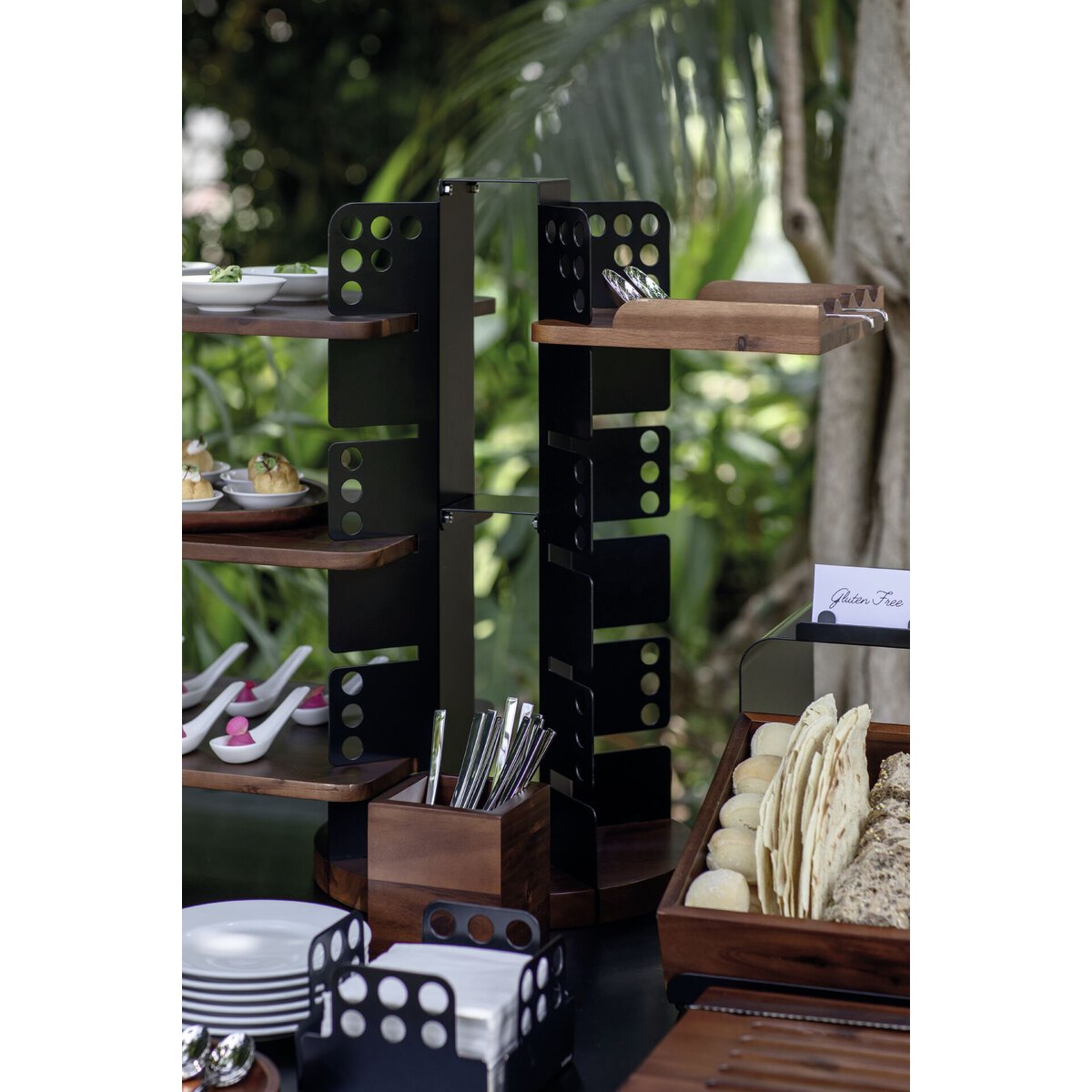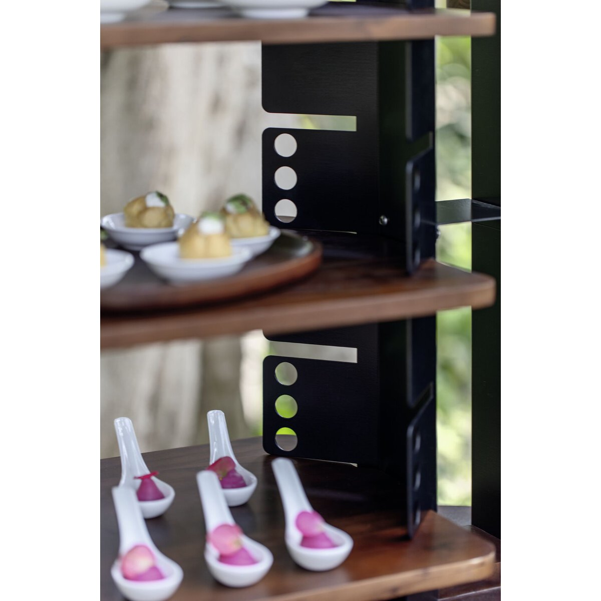 Edelstahl, schwarz beschichtet, Fuß Akazienholz, braun. Passend dazu Einlageböden 17092, 17093, 17094 u. 17095.