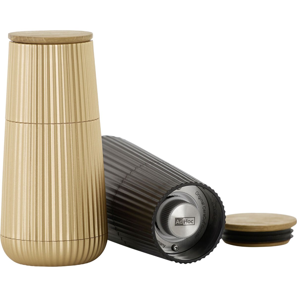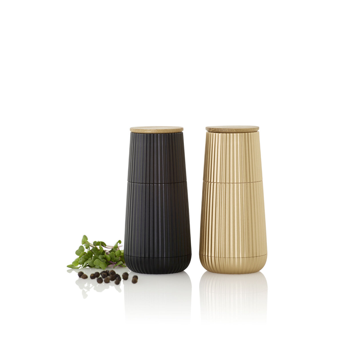 Mühlen-Set mit Kunststoffgehäuse und Eichenholz-Aromaschutzkappe. Hochleistungs-Ceramic Mahlwerk CeraCut ®. Stufenlose Mahlgradeinstellung. Pro Verpackung 1x schwarze Mühle, 1x goldene Mühle, mit je 1x Eichenholzdeckel. Nicht spülmaschinengeeignet.