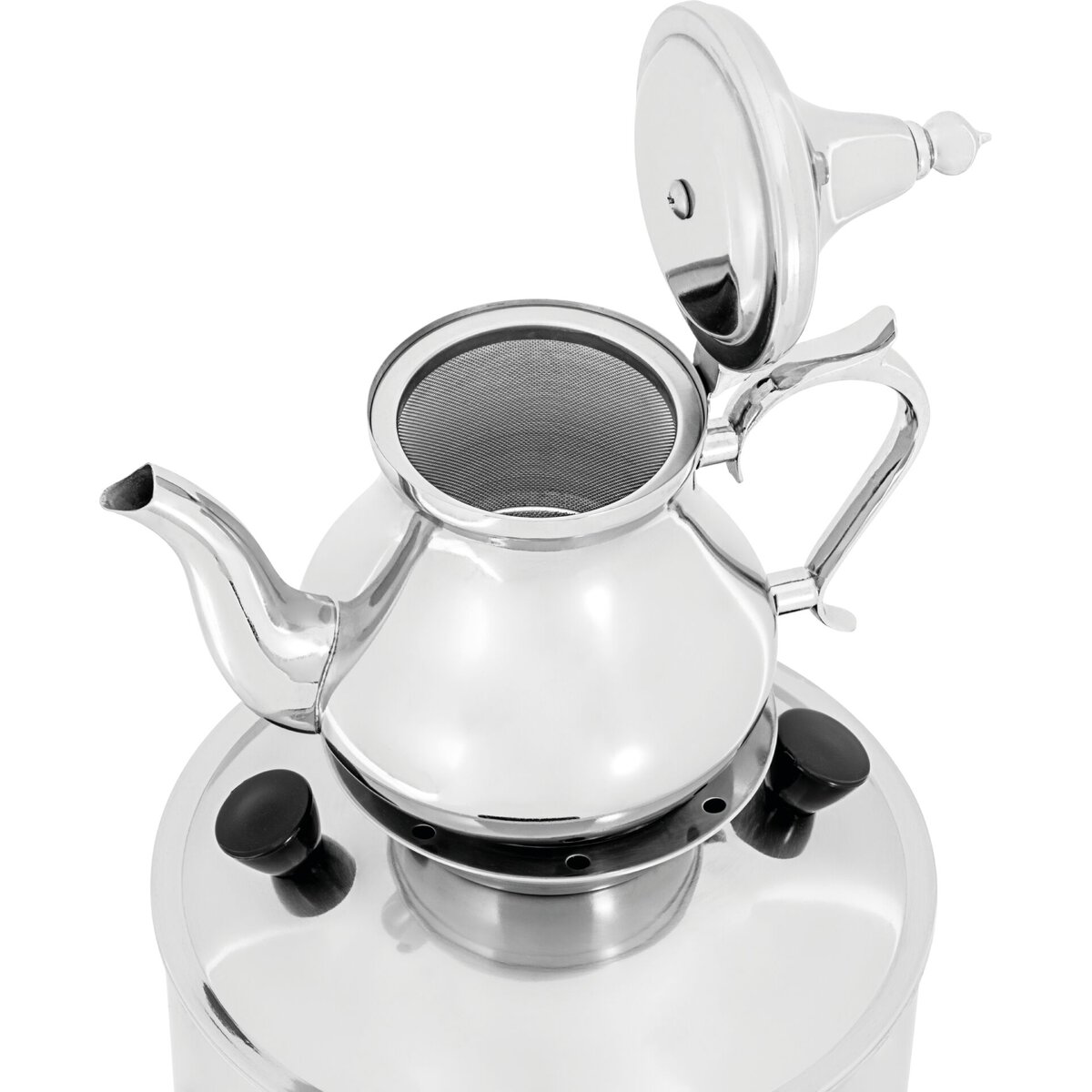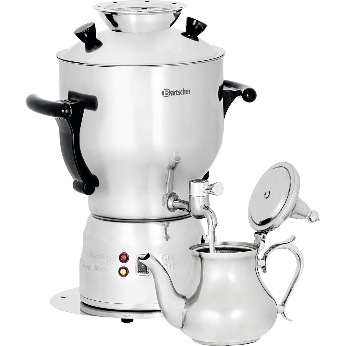 Edelstahl, stufenlose Temperaturregelung, Überhitzungsschutz, Warmhaltefunktion, Temperaturbereich 30°C-100°C, automatische Abschaltung, Gläser/Tassenhöhe max. 12,5 cm, inkl. 1 Teekanne Inhalt 1 Liter, Teesieb.