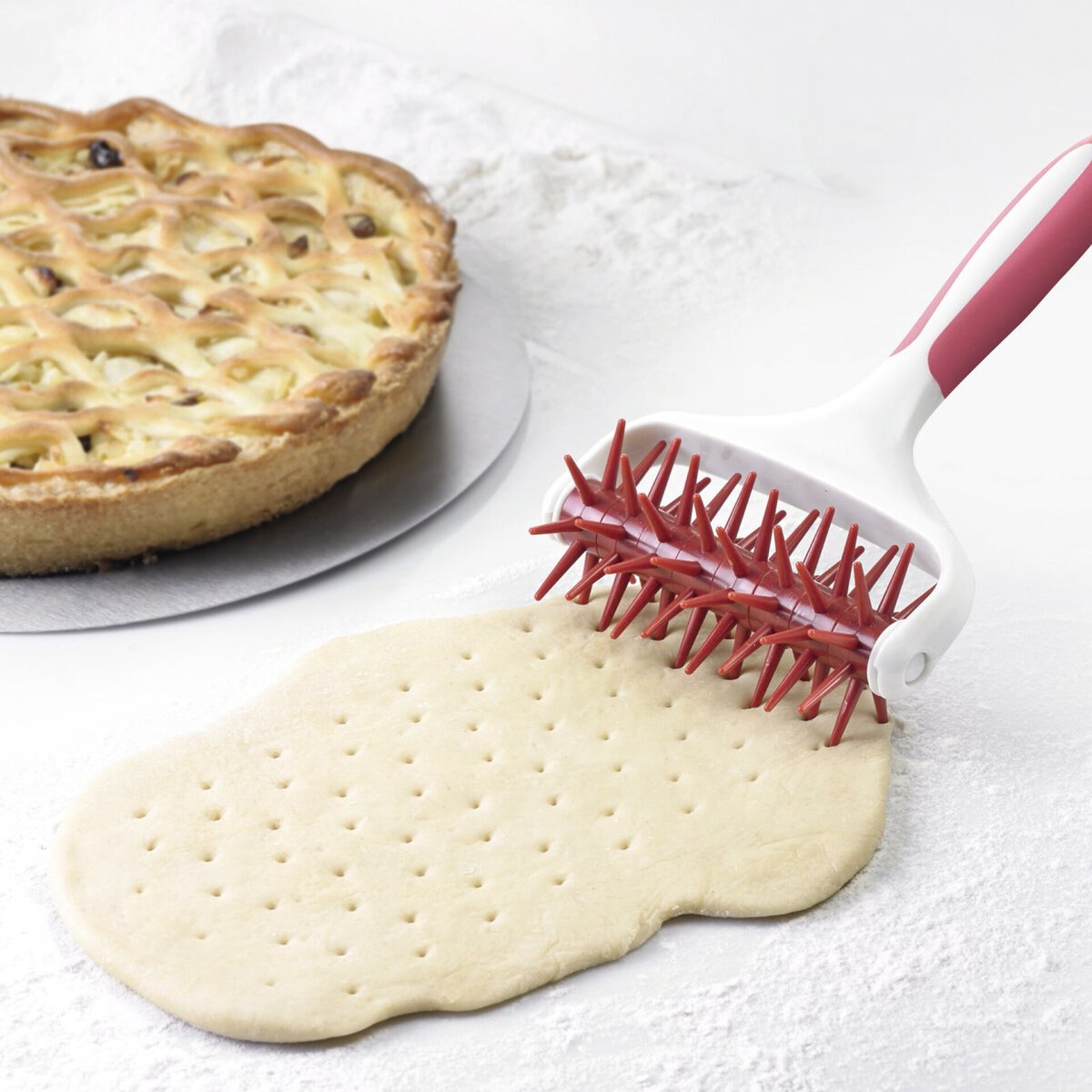 Material: TPE = Thermoplastische Elastomere u. ABS = Acrylnitril-Butadien-Styrol, gummierter Griff, die ideale Hilfe, um den Teigboden mit Löchern zu versehen, vermeidet Blasenbildung beim Backen, spülmaschinengeeignet.