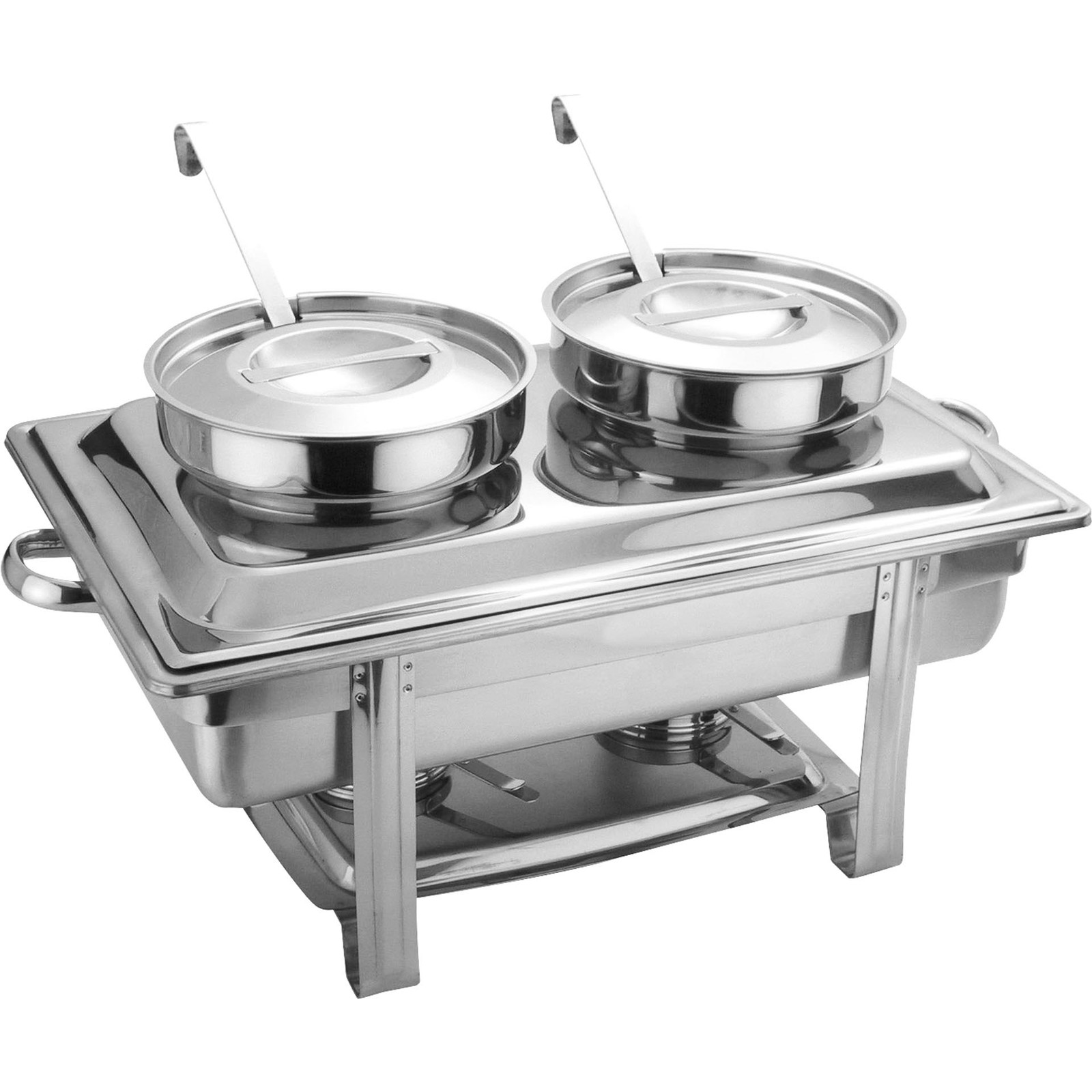 Edelstahl 18/10, poliert, komplett mit Wasserbad und 2 Suppeneinsätzen (je 4 Liter), mit 2 Deckel (mit Löffelausschnitt), 2 Schöpflöffeln und 2 Brennstoffhaltern. 2 Schnäbel am Rahmen können als Deckelhalter genutzt werden.
