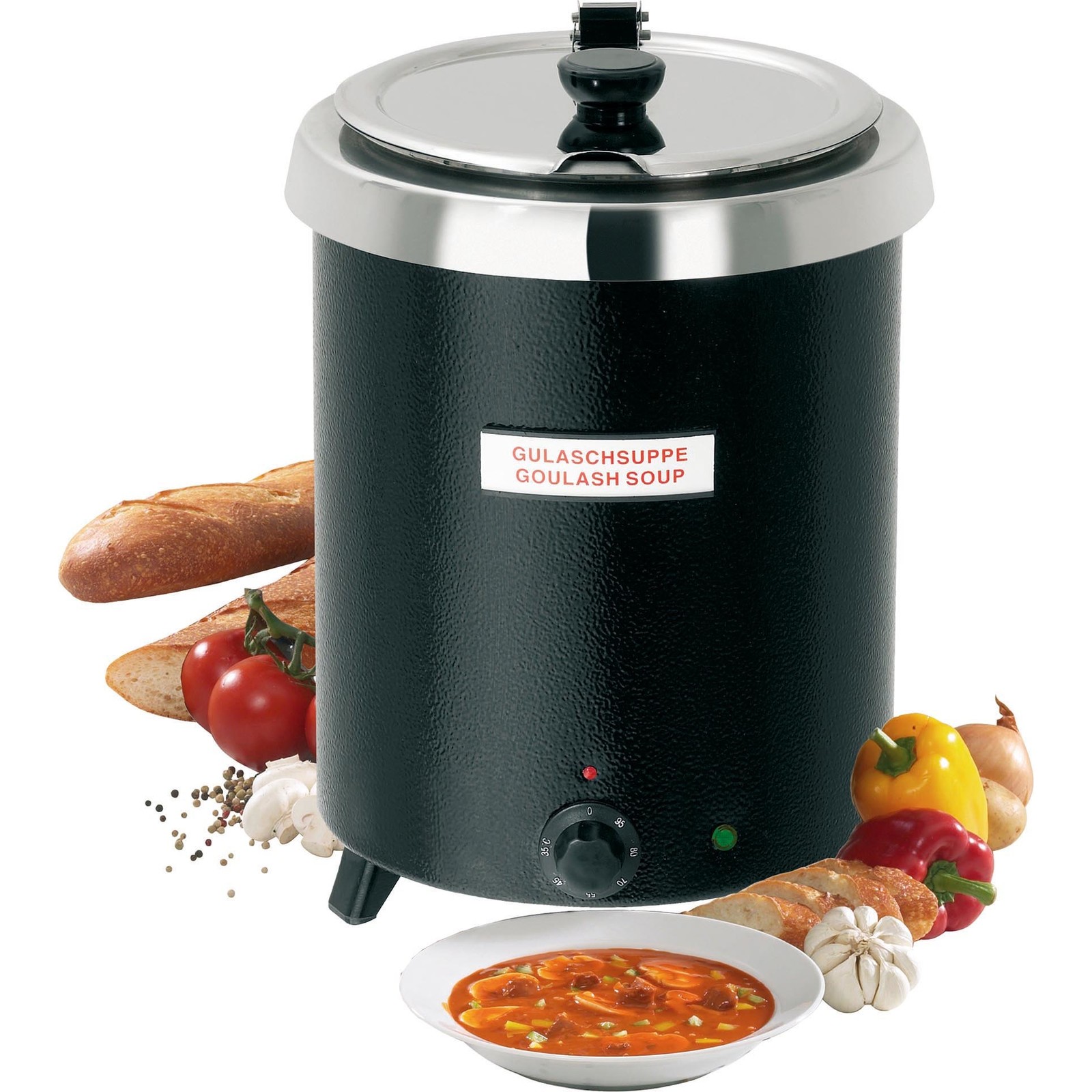 Außentopf schwarz, Stahlblech lackiert, herausnehmbarer Einsatz aus Edelstahl, Regelthermostat von 30°C bis 95°C, mit dreh- und klappbarem Edelstahldeckel, Löffelaussparung, hitzeisolierter Griff. Inkl. 8 magnetisch haftender Suppenbeschriftungen.