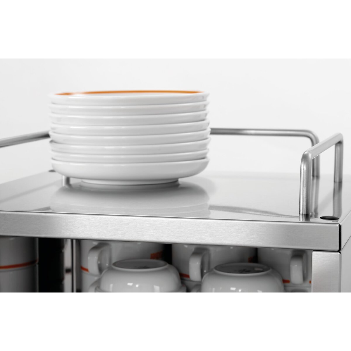 Edelstahl, für bis zu 72 Tassen, Tassentemperatur ca. 60°C. Die getrennt schaltbare Wärmezufuhr lässt sich für beide Ebenen stufenlos regulieren. Ablagefläche BxT in cm: 25x25, zum Abstellen von Untertellern, Tassen etc. Gewicht: 10,3 kg.