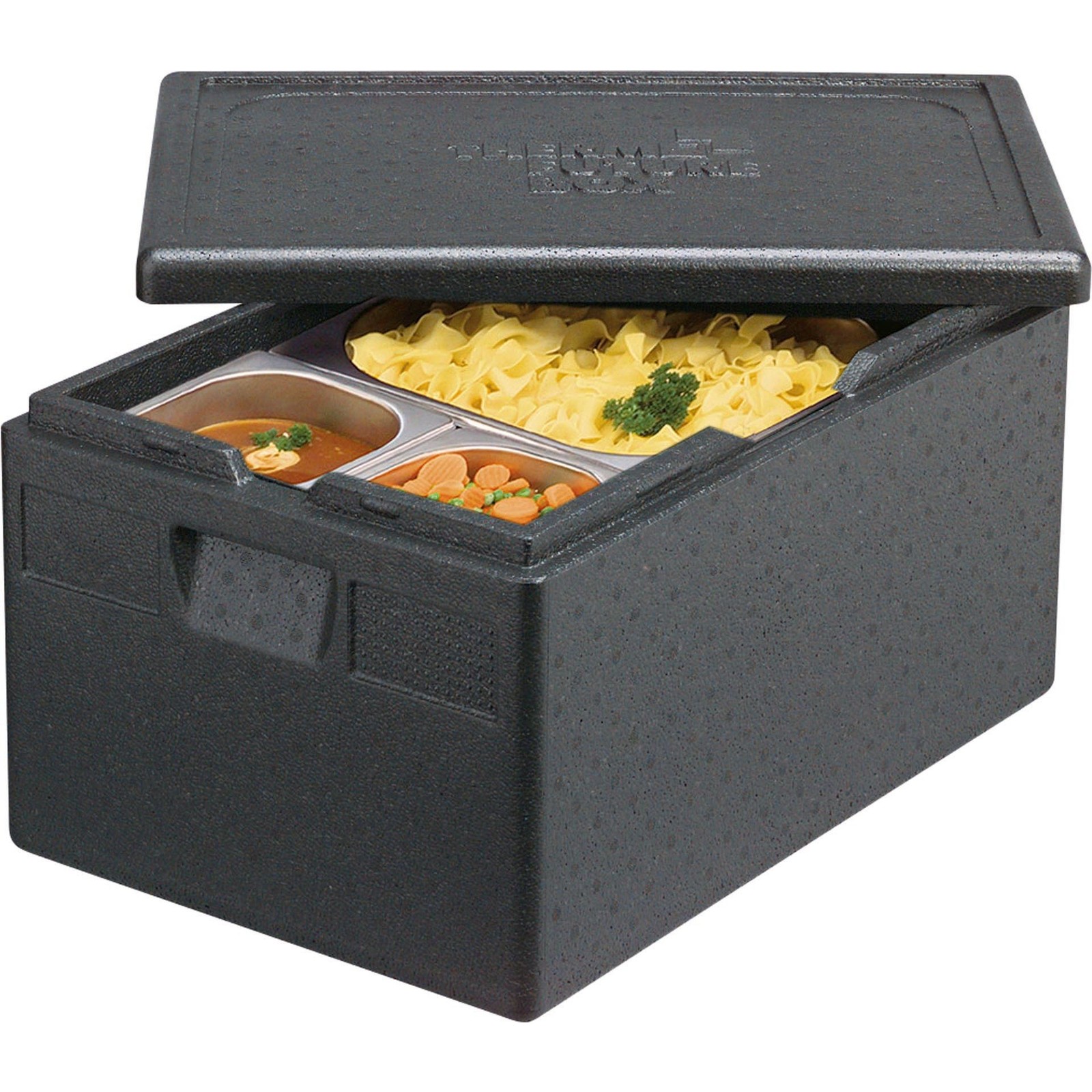 EPP, schwarz, bruchstabil, langlebig, leicht, hygienisch. Beste Isoliereigenschaften (-40°C bis +120°C), sicherer Lebensmittel-Transport heiß und kalt. Griffmulden erleichtern das Be- und Entladen. Für Stapelbehälter, Backbleche oder Tabletts. Festsitzender Deckel durch hohen Noppenstapelrand.
