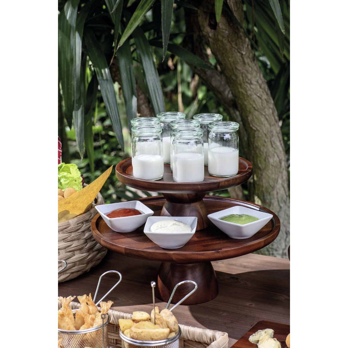 Akazienholz, braun. Seitlich leichte Aufkantung. Nicht spülmaschinengeeignet.