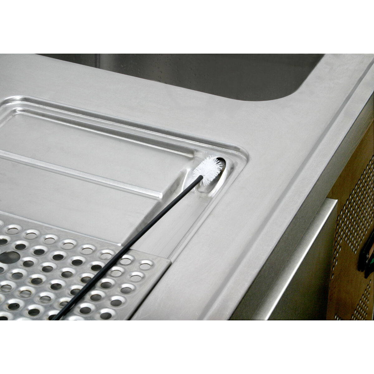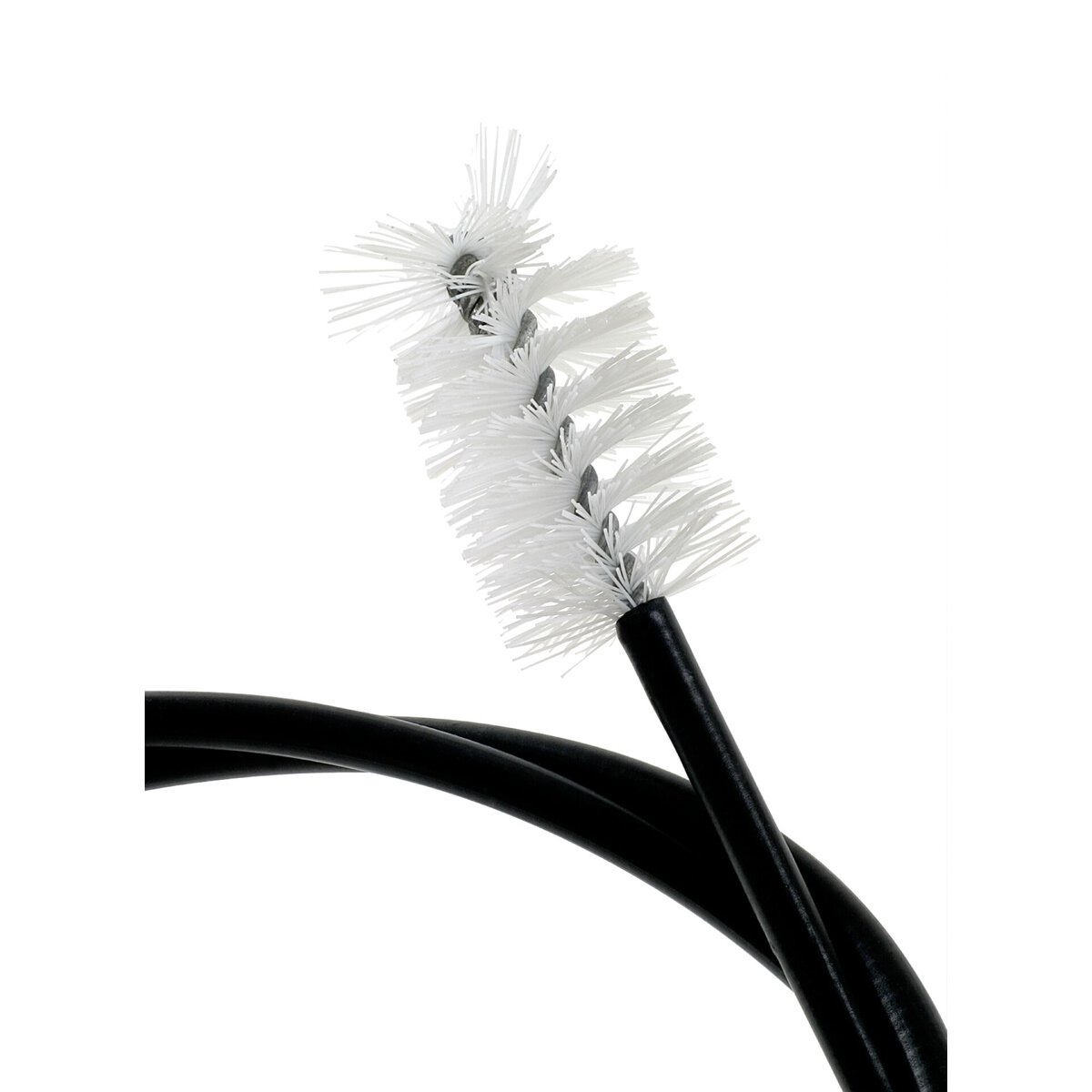 Spezielle Tropfmuldenbürste zum Reinigen von Abläufen der Tropfmuldenbecken. Der Bürstenkopf ist mit einer flexiblen Drahtkern-Führung von 125 cm Länge verbunden. Der Drahtkern ist mit einer schwarzen Kunststoffummantelung versehen, Ø 4mm, und lässt sich leicht in die Abläufe einführen und anschließend problemlos reinigen. Der Bürstenkopf ist aus weißem Nylon, Ø2,5x3,5cm lang.