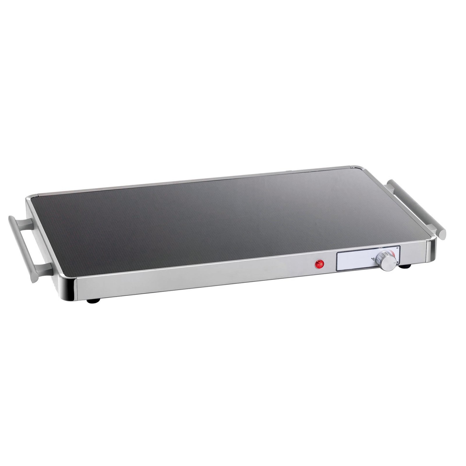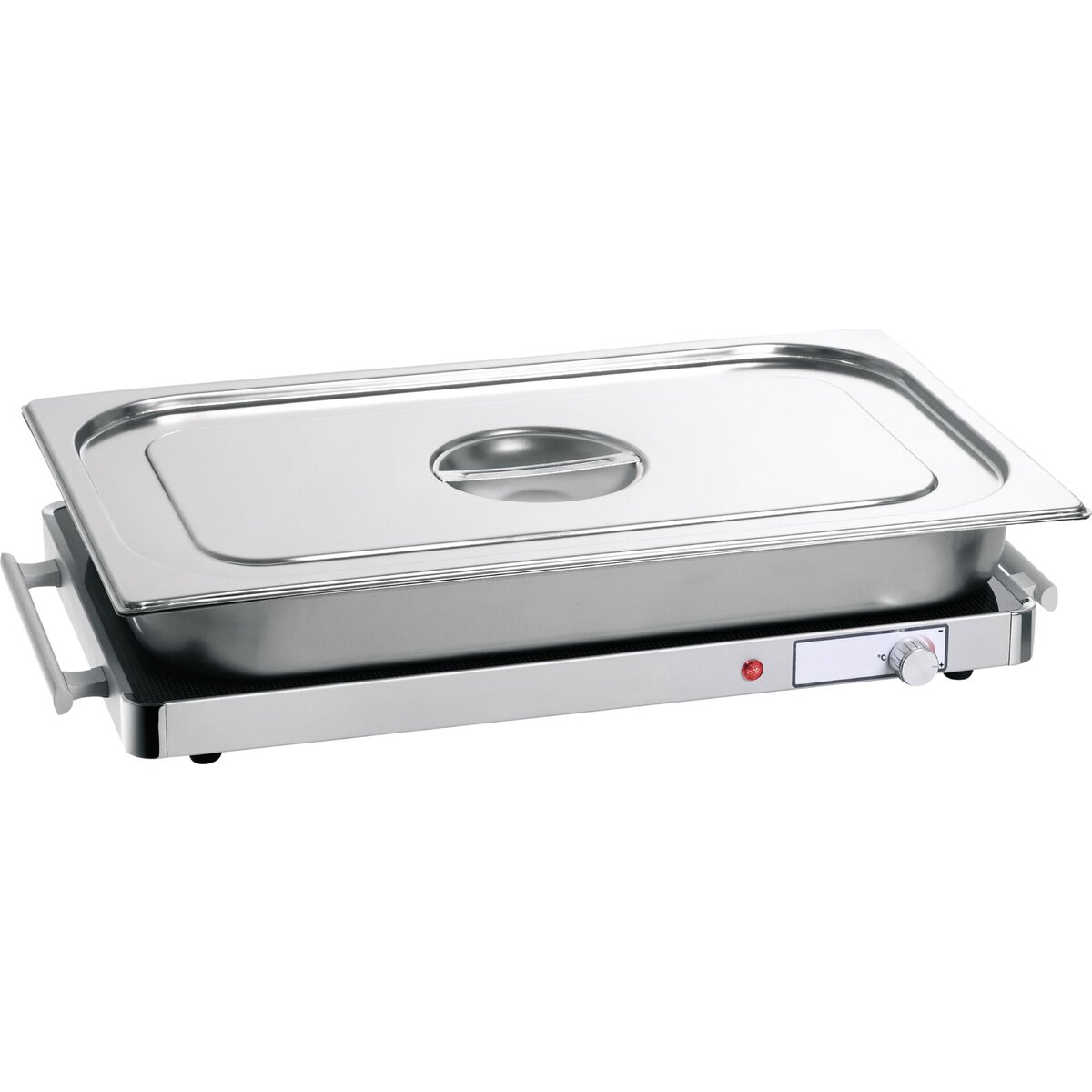Elektro, für 1/1 GN und 2x 1/1 GN. Gehäuse aus Aluminium, Oberfläche aus Glas. Mit Ein-/Aus-Schalter, Kontrolllampe und stufenloser Temperaturregelung von 30°C bis 95°C. Oberflächentemperatur max. 95°C. Einfache Reinigung.