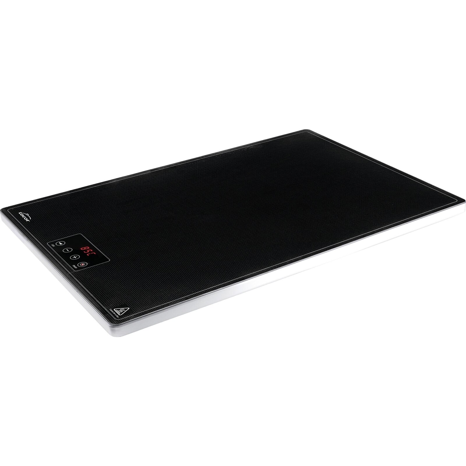 Warmhalteplatte aus gehärtetem Glas mit Aluminiumrahmen. 55x38x3cm. Temperatur 65°C - 105°C. 220-240V, 50/60Hz. NICHT zum Kochen geeignet!